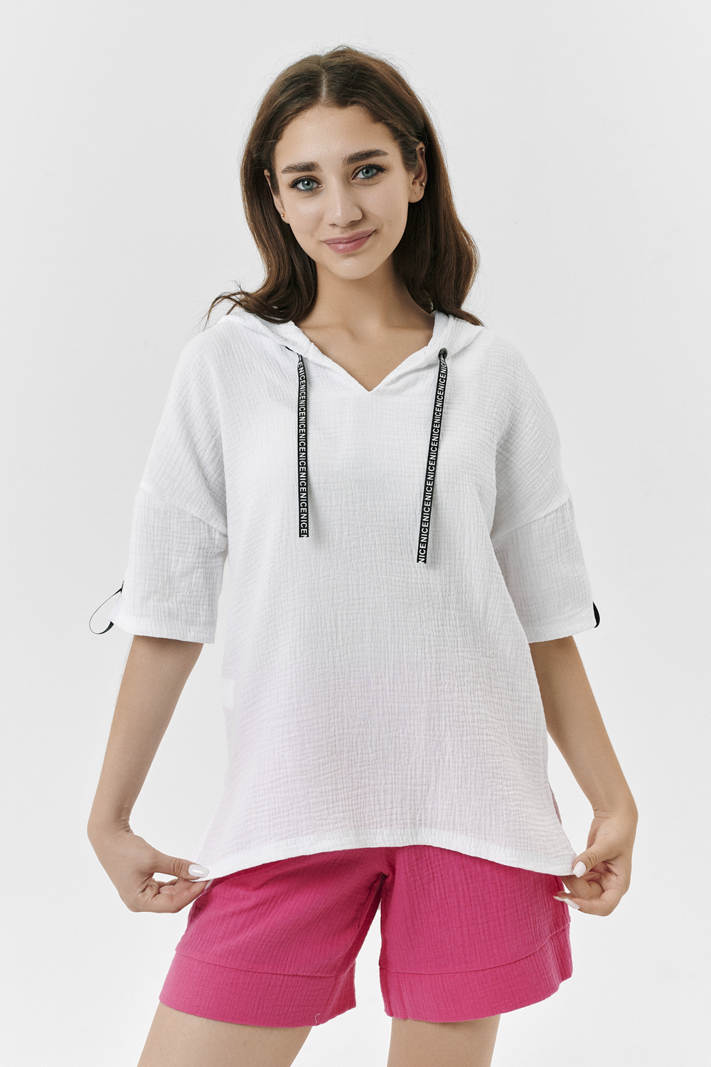 Туника прямая, свободная, с капюшоном, с удлиненной спинкой. Рукав короткий, с декоративными элементами вдоль рукава. В нижней части боковых швов обработаны разрезы.
