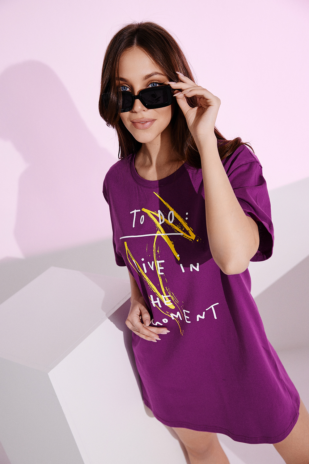 Туника - футболка в стиле оверсайз. Прямая, свободная, длиной выше колена, с округлой горловиной. Рукав короткий. Горловина обработана обтачкой из основного полотна.