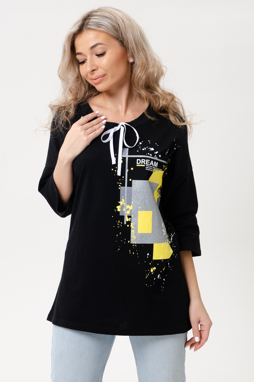 Туника женская прямого силуэта со спущенным втачным рукавом 3/4. Горловина обработана обтачкой, затягивается шнурком, рукава подшиты. Спереди красивый принт.