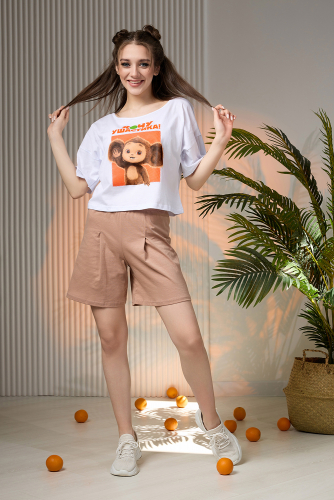 Туника-футболка в стиле оверсайз. Прямая, свободная, длиной выше колена, с округлой горловиной. Рукав короткий. Горловина обработана обтачкой из основного полотна.