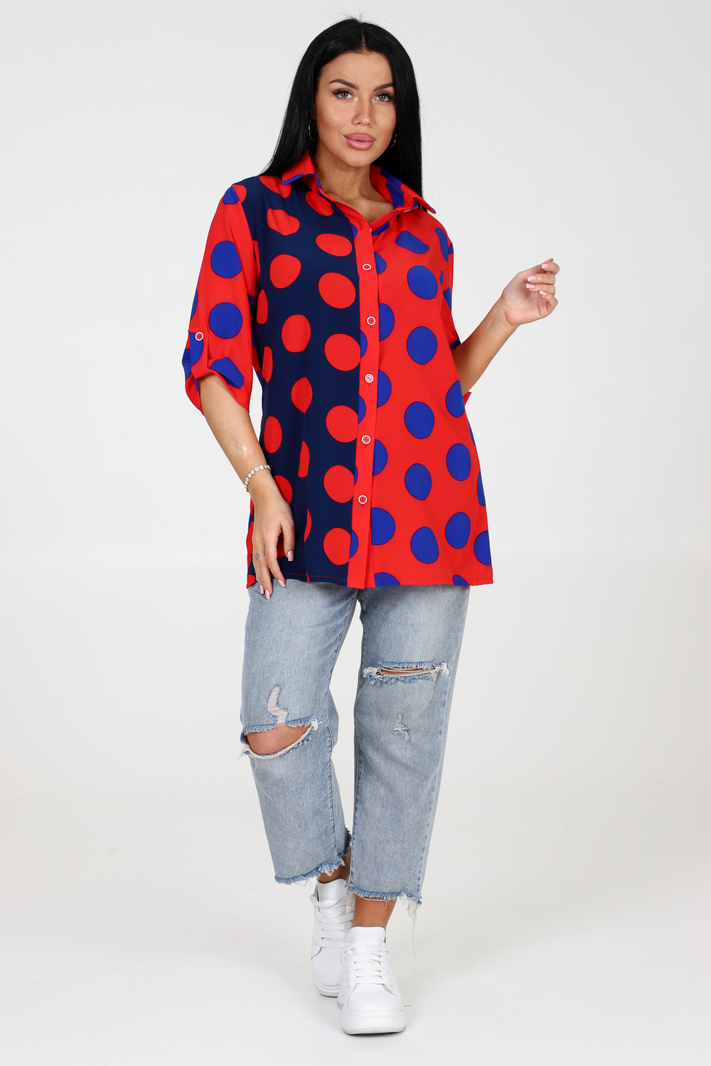 Наша туника - это верхняя одежда с особым рисунком в виде гороха, а также оригинальным сочетанием двух расцветок. Туника не только стильна, но и комфортна. Она обладает удобными рукавами три четверти подобранными на паты, что придает ей еще более элегантный вид. Модель также дополнена рубашечным воротником, который придает тунике изысканности. Мы предлагаем Вам купить эту уникальную тунику и погрузиться в мир моды и комфорта. Наш товар соответствует самым высоким стандартам качества, поэтому Вы можете быть уверены, что она прослужит Вам долгое время. Женская туника на пуговицах, изготовленная из ткани Прадо, с рисунком гороха и оригинальным сочетанием двух расцветок, станет Вашим незаменимым атрибутом стиля и элегантности. Не упустите возможность приобрести эту модель уже сегодня!