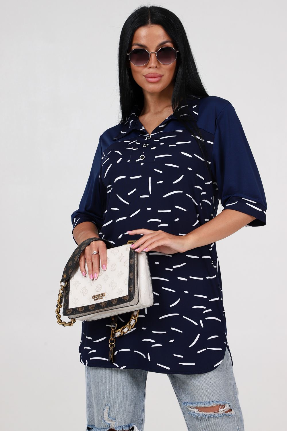 Низ женской туники имеет полукруглую форму, что делает его ещё более изящным и женственным. Комбинация всех этих элементов создаёт неповторимый образ, который подчеркнет вашу неповторимость.