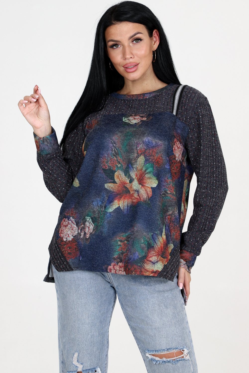 Уникальная туника с боковыми разрезами, которая непременно привлечет внимание окружающих. Передняя полочка на кокетке с изящной декоративной лентой придает этой модели эксклюзивный вид. Кроме того, передняя часть туники немного короче спинки, что создает эффектную силуэтную линию. Округлый вырез с кантом великолепно дополняет общий дизайн туники, делая ее еще более привлекательной. Туника с длинным рукавом на манжете отлично подойдет для холодного времени года, обеспечивая комфорт и тепло.