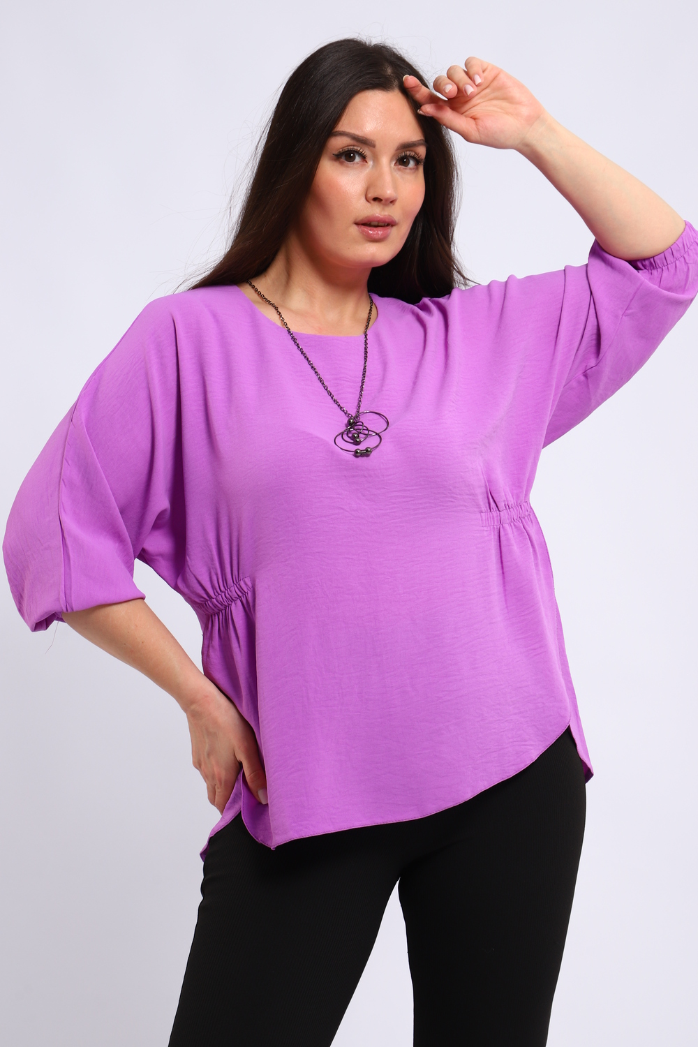 Особенностью этой туники является ее уникальный крой летучая мышь, который создает эффектный силуэт и скрывает небольшие недостатки фигуры. Свободный и воздушный фасон обеспечивает максимальную свободу движений, а бока изделия, собранные на резинку, позволяют регулировать посадку и подчеркнуть талию.
