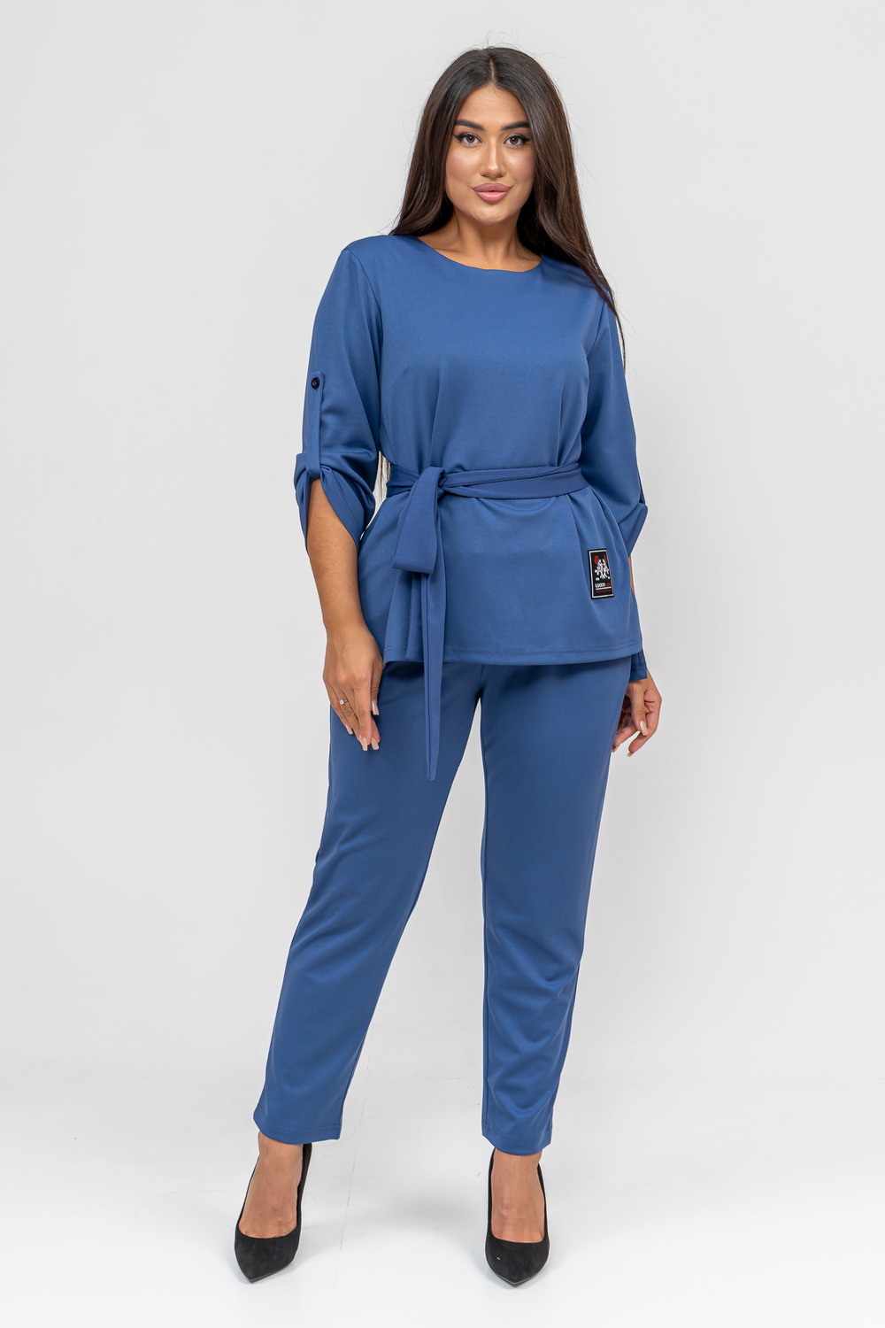 Костюм состоит из брюк и туники, которые гармонично дополняют друг друга. Брюки выполнены из высококачественного материала, который обеспечивает свободное движение и сохраняет форму даже после длительного использования. Туника подчёркивает женственность благодаря изящному крою, создавая элегантный образ. В комплект также входит пояс, который акцентирует талию и добавляет изысканности общему образу.