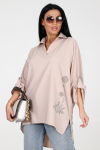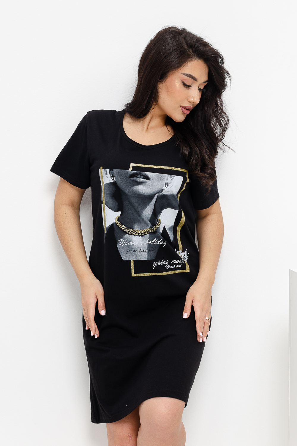 Туника слегка приталена, что создаёт красивый силуэт. Цвет тёмно-синий, почти чёрный, принт не резиновый, изделие мягкое. На 52-54 взяла 54 - сидит плотно, кто предпочитает свободную посадку берите на размер больше. Мой рост 165 длина туники ниже колена, модель видимо 175-180, на фото короче. Но мне так даже больше понравилось.