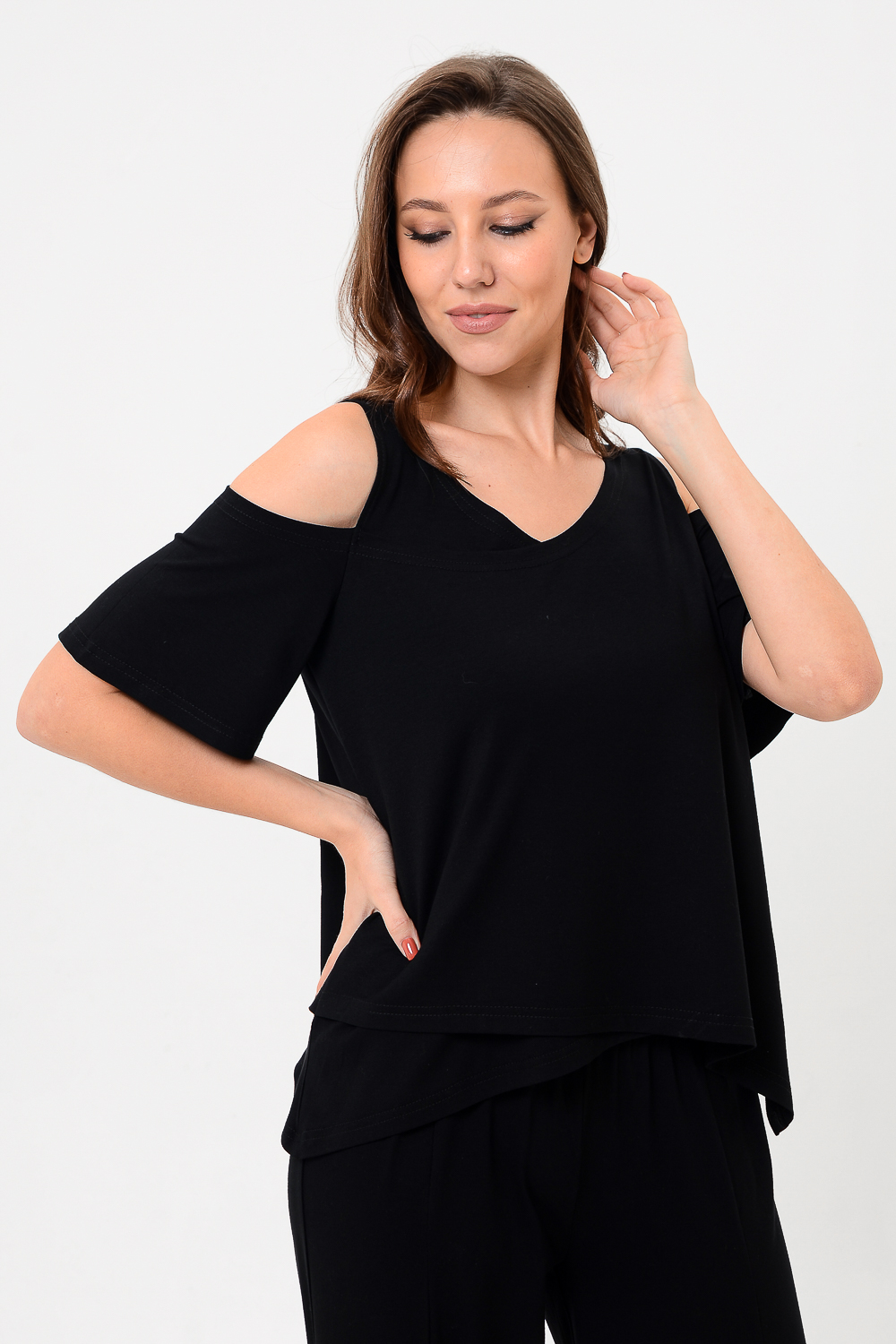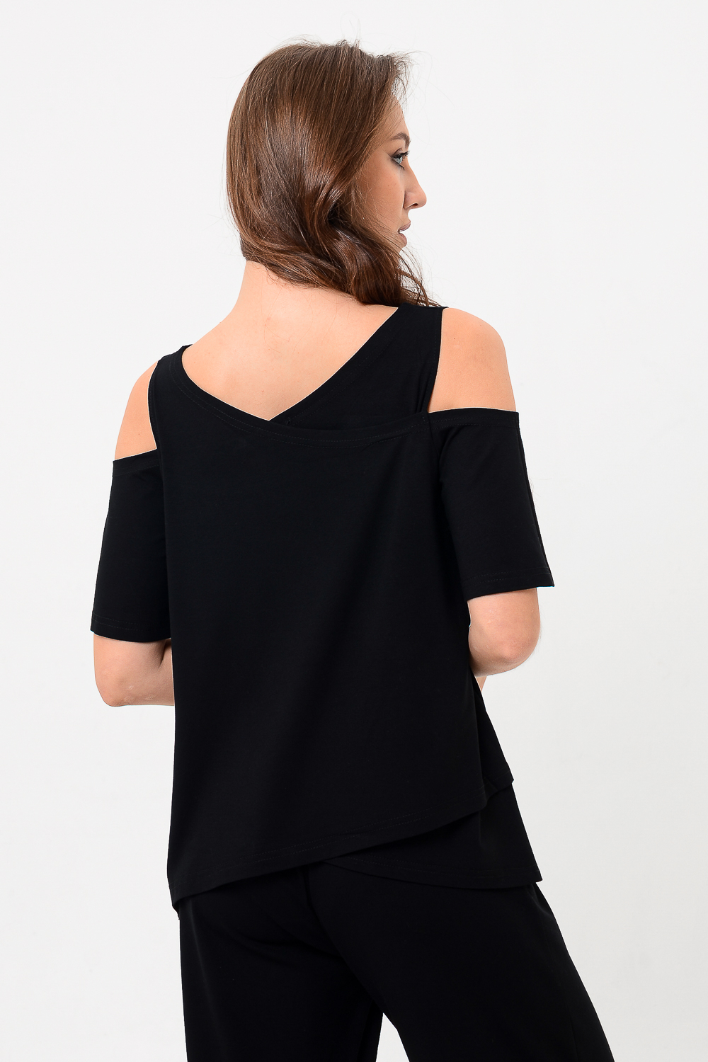 Дизайнерская женская блузка свободного кроя. Её можно носить как вечернюю или офисную, так же подойдет для жаркой погоды. Модель выполнена из приятной на ощупь дышащей ткани, не просвечивает. Особенностью блузки являются двойные полочка и спинка. Рукав с открытым плечом. Цвет: черный;белый;голубой; Материал: вискоза;вискоза; Состав: вискоза 92%, лайкра 8%.