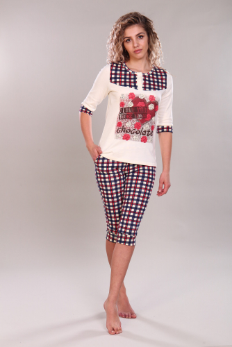Элегантный женский комплект. Верх футболка с рукавами 3/4, украшенная модными клетчатыми вставками. Бриджи с классическим клетчатым узором гармонируют с декоративными элементами футболки. Модель выполнена из премиального интерлока. Идеально подходит для уютных вечеров и комфортного сна.