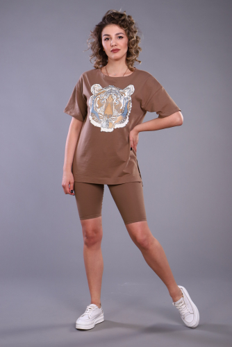 Комплект двойка для спорта и отдыха. Удлиненная оверсайз футболка с разрезами по бокам и принтом в виде тигра с добавлением глиттера. Модель представлена в нескольких цветах.