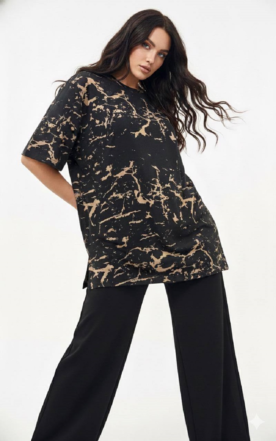Мы позаботились о том, чтобы этот костюм стал идеальным дополнением к гардеробу каждой девушки, независимо от ее роста. Свободный крой и продуманные пропорции позволяют костюму прекрасно смотреться как на миниатюрных девушках, так и на высоких красавицах. Брюки легко адаптируются под разную длину ног, а футболка создает гармоничный образ, подчеркивая достоинства фигуры.