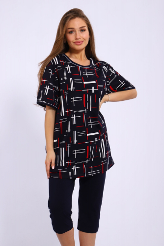 Костюм женский футболка и бриджи .Футболка свободного кроя, плечо спущенное на манжете. Низ футболки собирается на шнурок .Бриджи на резинке, без карманов.