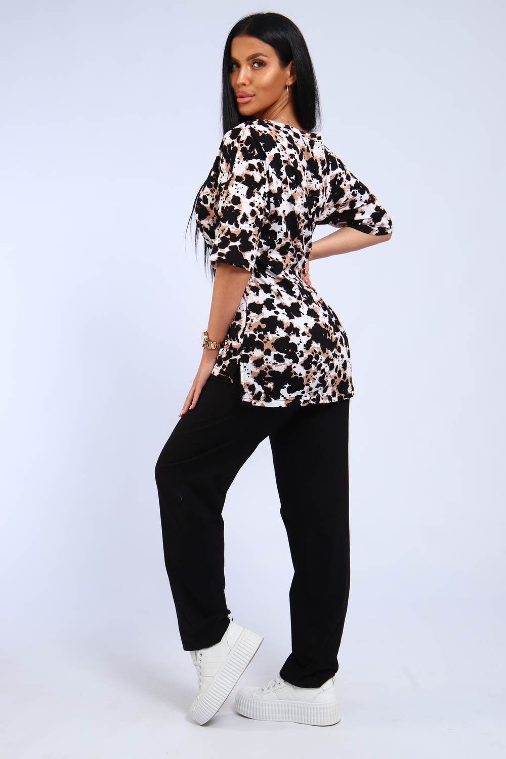 Костюм женский с брюками. Футболка полуприлегающего силуэта. Короткий рукав со спущенным плечом. Брюки прямого кроя. Цвет: черный; Материал: кулирка;кулирка; Состав: 100% хлопок.