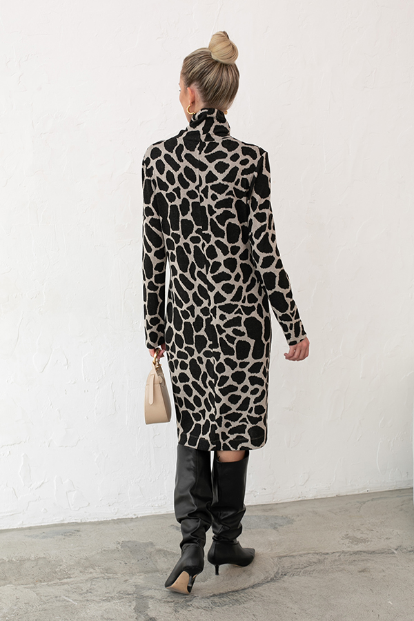 Платье полуприлегающего силуэта из эластичного полотна с жаккардовым анималистичным узором. Втачной длинный рукав. Оригинальный вырез горловины оформлен воротником-стойкой.