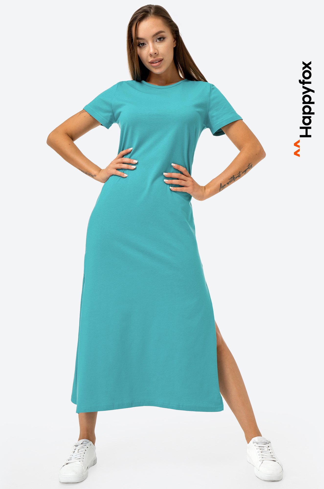 Однотонное ярко-бирюзовое платье миди подходит для дома. Трикотажное свободное платье подойдет на каждый день.
