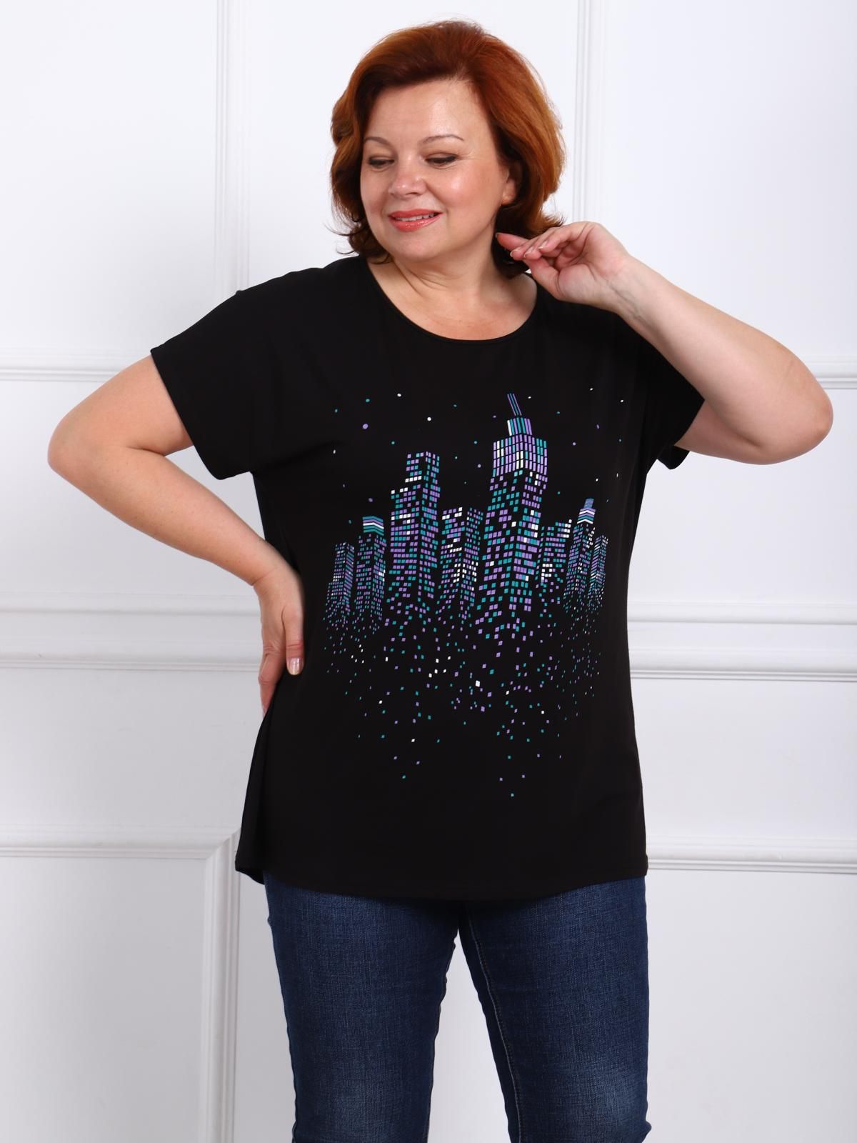 Футболка женская свободного силуэта  со спущенной линией плеча. Круглый вырез  горловины окантован бейкой. В центре   полочки- яркий принт.
