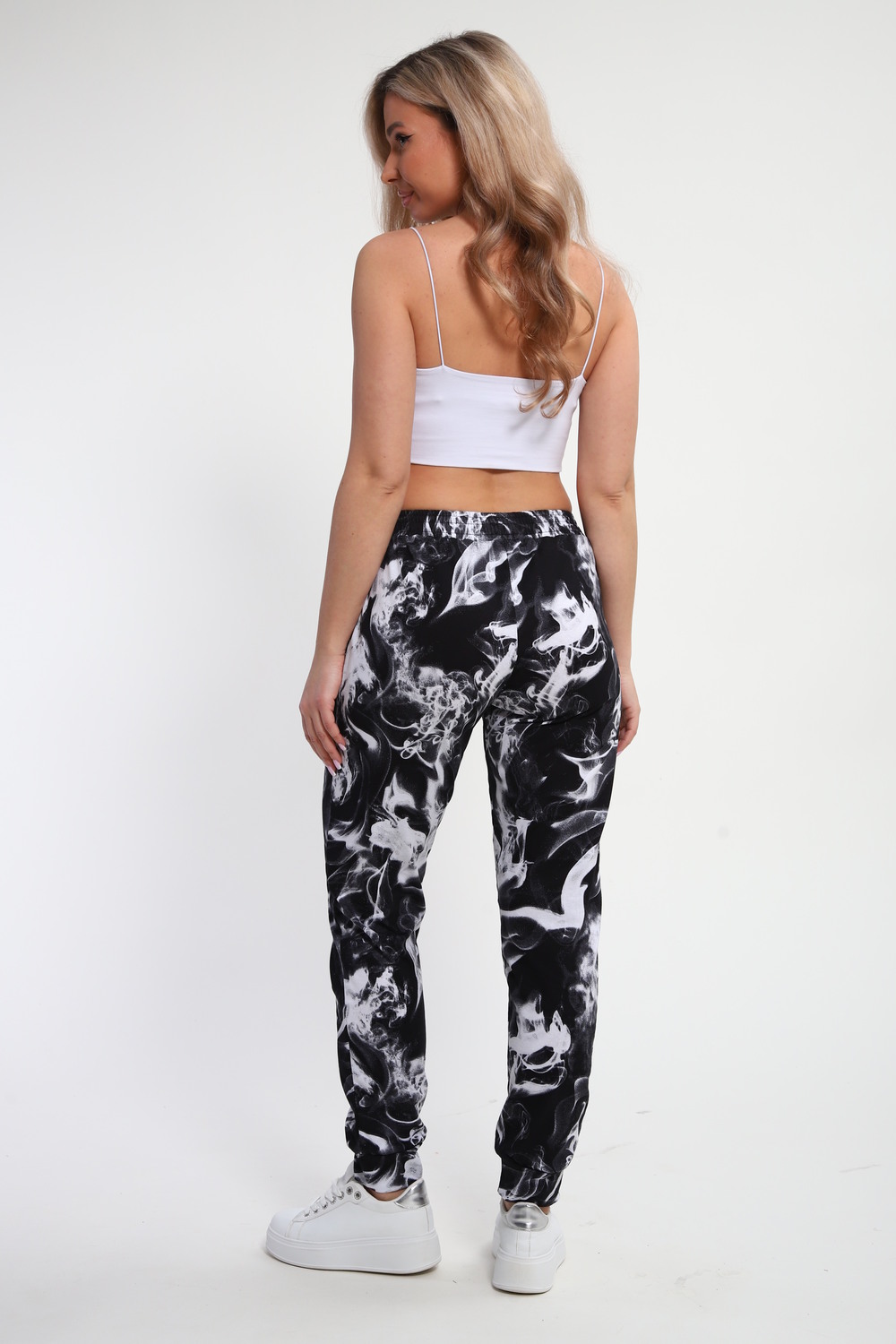 Женские брюки для дома созданы для максимального комфорта и уюта в повседневной жизни. Модель выполнена из мягкого текстиля на основе хлопка, что делает изделие особенно легким и приятным к телу. Трикотажные штаны с резинкой на поясе обеспечивают отличную посадку по фигуре, не стесняют движений и подходят для разных размеров, в том числе больших. Это отличный выбор одежды для сна или отдыха после насыщенного дня. Цвет: черный/белый Дым; Материал: кулирка;кулирка; Состав: Хлопок 100%.
