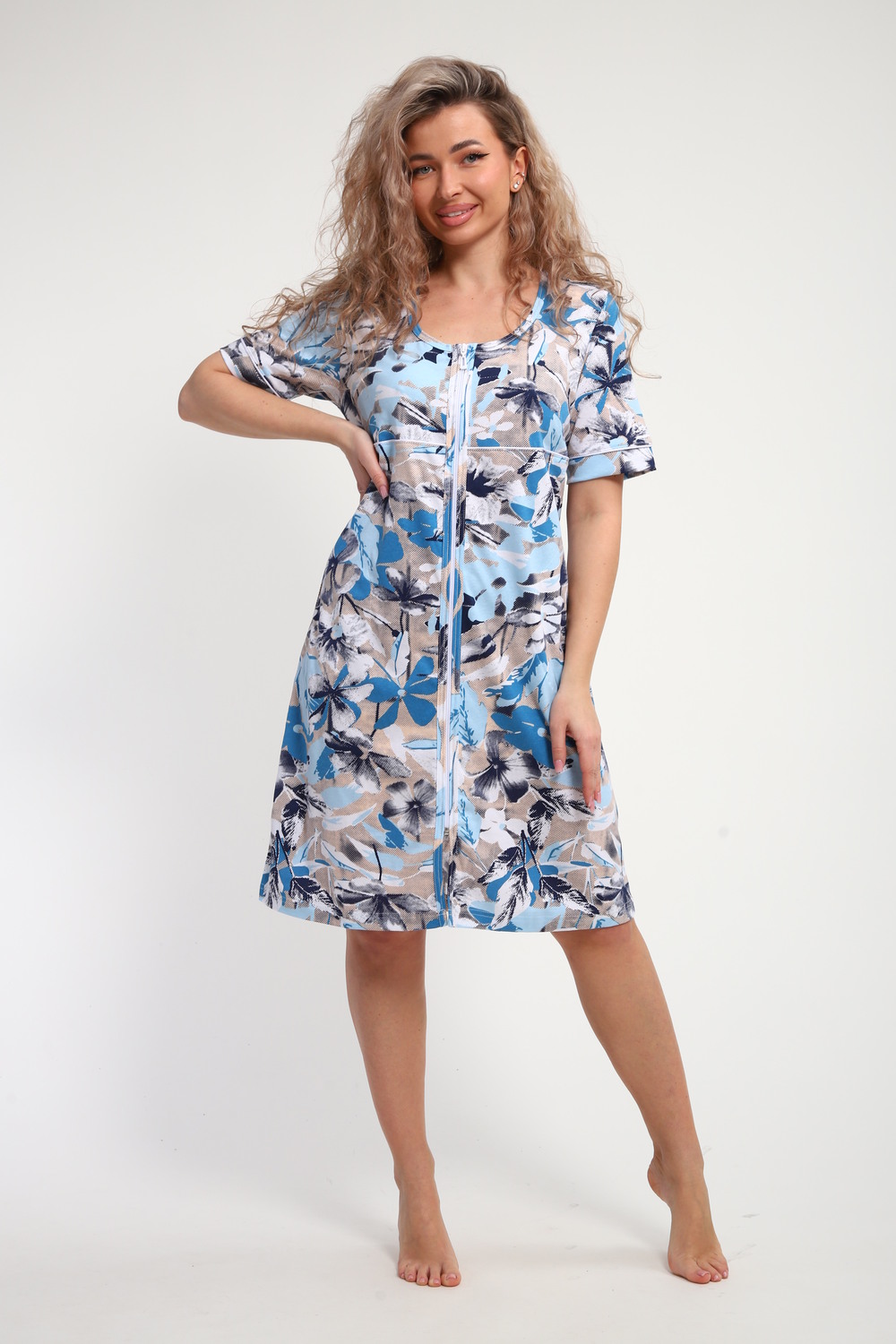 Почувствуйте себя комфортно и уютно каждый день с этим женским домашним халатом миди на молнии. Модель, декорированная романтичным принтом с цветами по всей поверхности, станет ярким акцентом вашего домашнего гардероба и подарит отличное настроение. Цвет: голубые цветы;черный/белый Дым;синий/красный/белый Полосы с буквами Love;Пончики зеленый; Материал: кулирка;кулирка; Состав: Хлопок 100%.