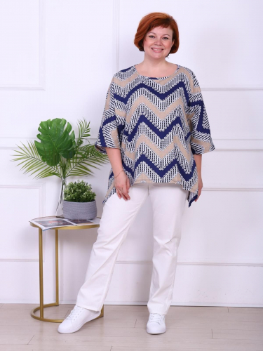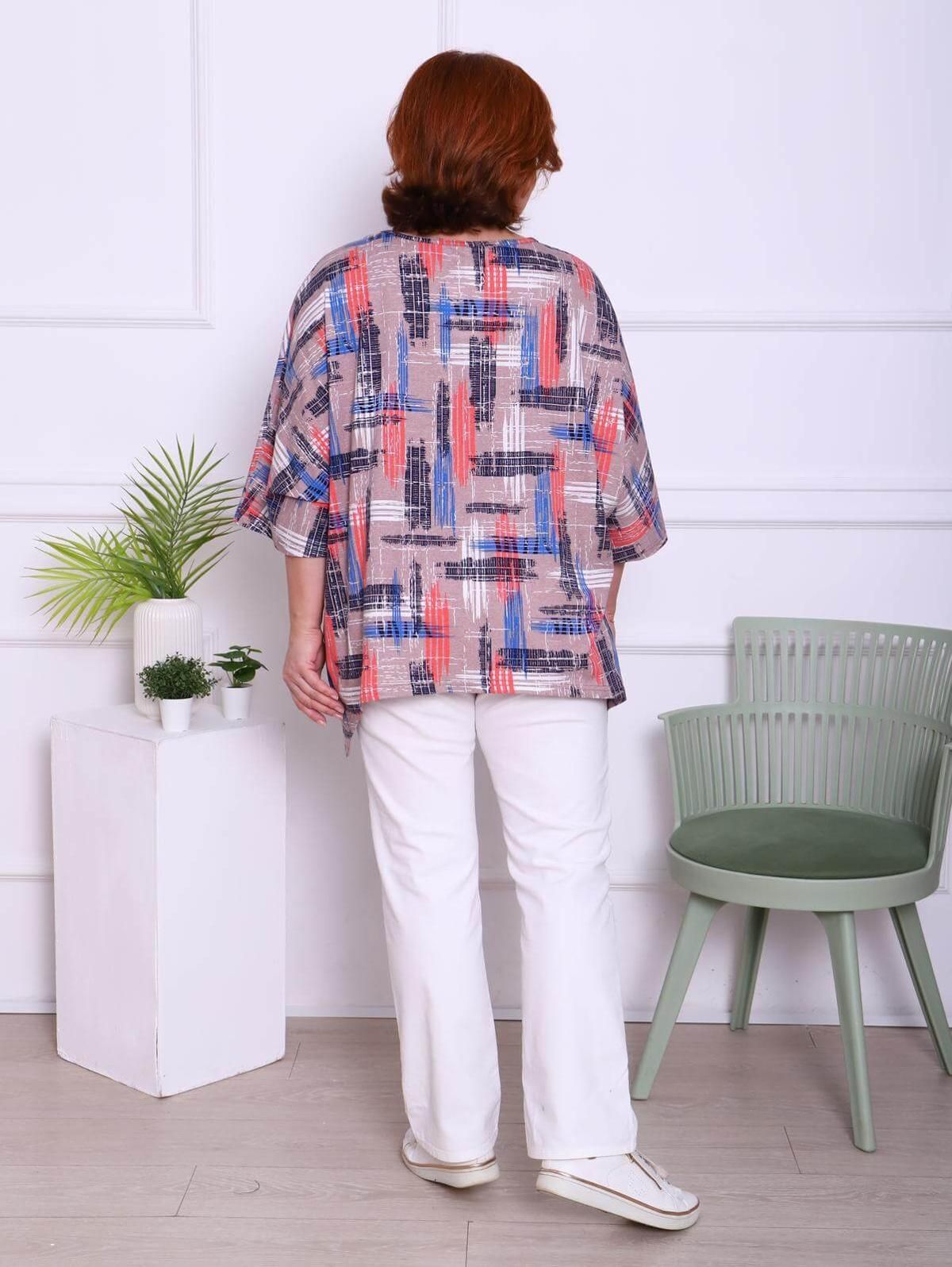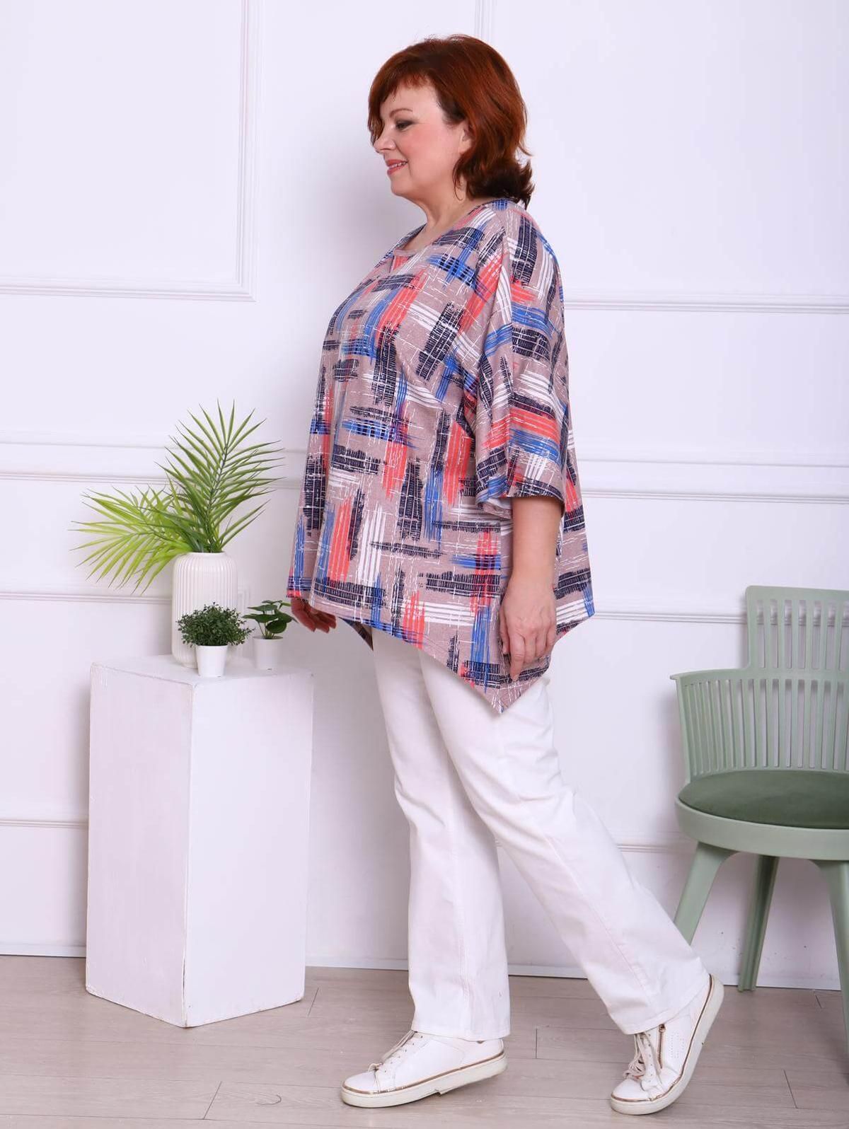 Женская футболка выполнена из полотна "кулирка". Футболка свободного кроя с рукавом "летучая мышь" длиною 3/4. Горловина круглой формы обработана бейкой, низ футболки разноуровневый.