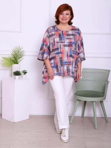 Женская футболка выполнена из полотна "кулирка". Футболка свободного кроя с рукавом "летучая мышь" длиною 3/4. Горловина круглой формы обработана бейкой, низ футболки разноуровневый.