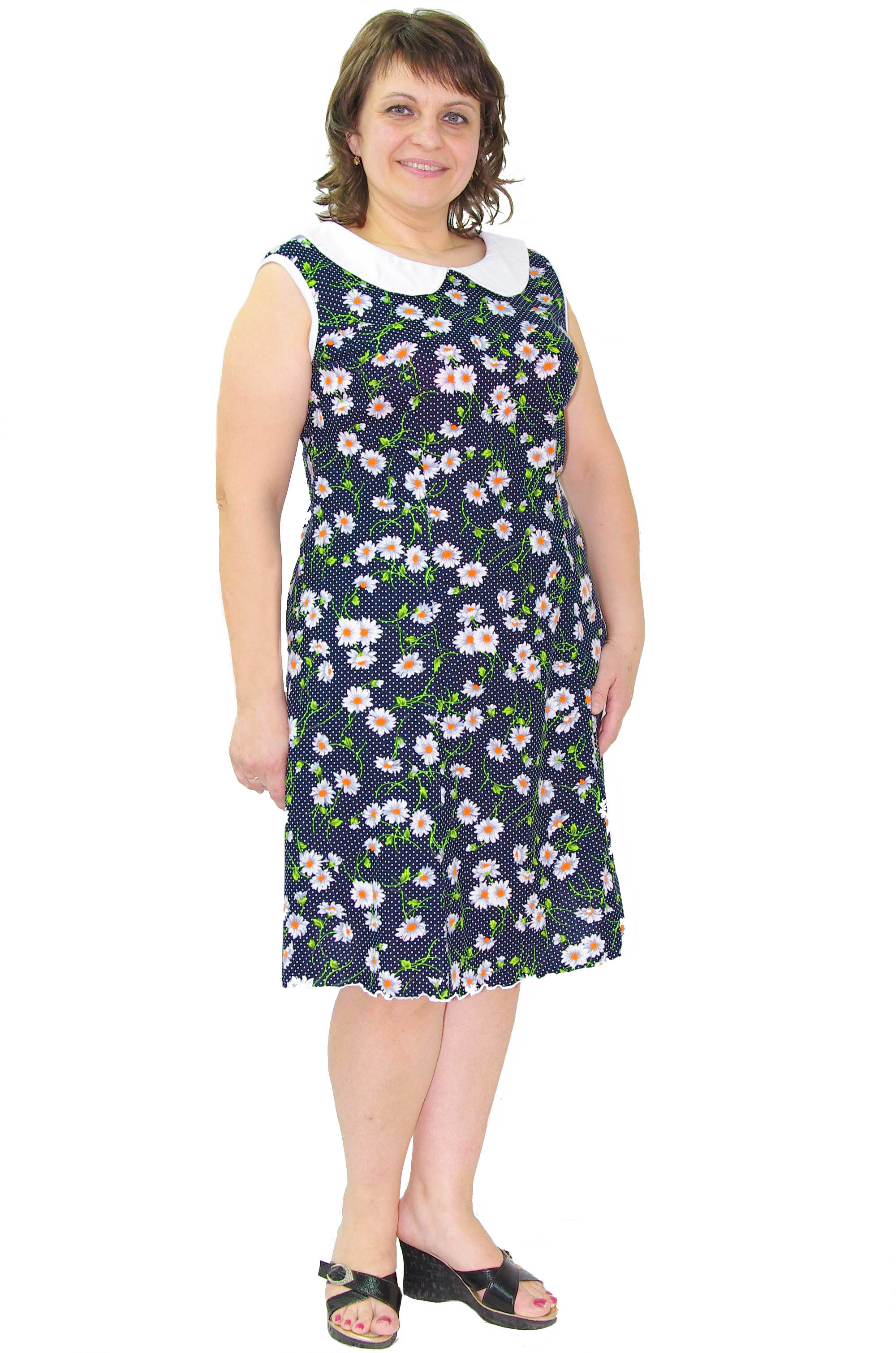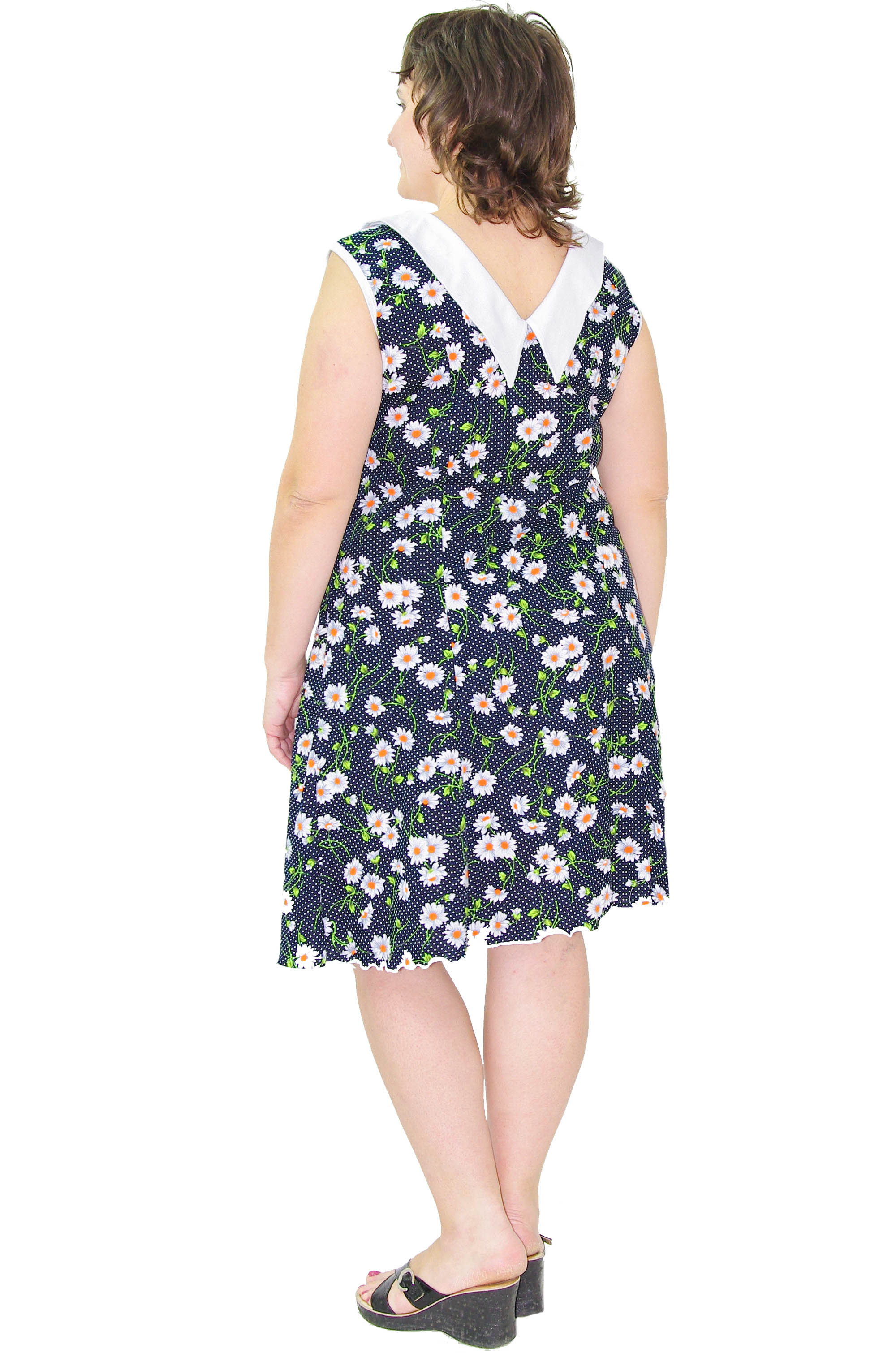 Женственный приталенный сарафан из качественного кулирного полотна. Контрастный воротник, на спинке V-образный вырез.