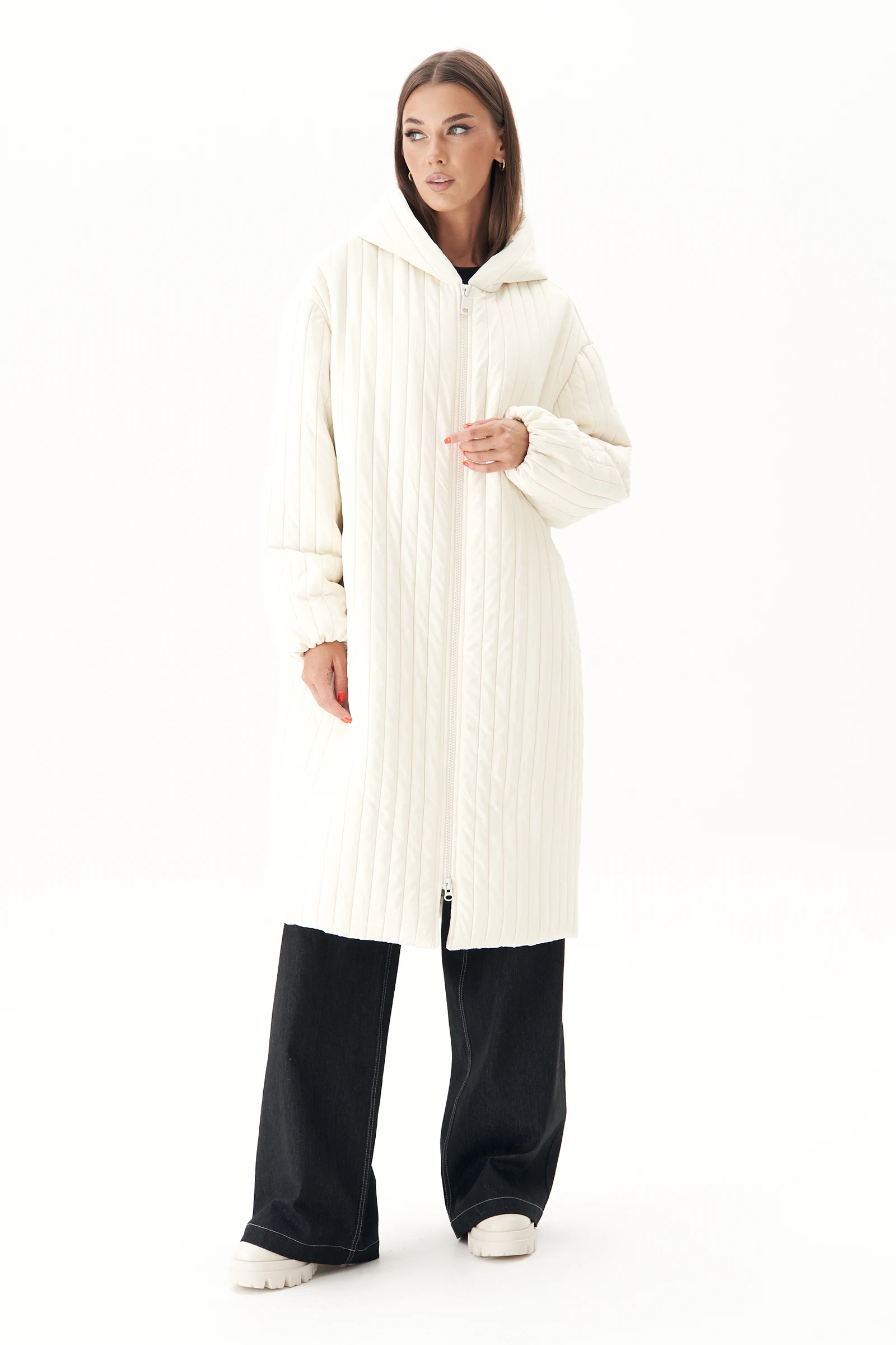 Стёганое пальто по-прежнему остаётся в топе трендов среди стритстайлеров. Длинное стёганое пальто - это лучший способ оставаться в тепле и выглядеть супер-актуально.Свободный оверсайз-силуэт, покрой с заниженной линией плеча и рукавом, расширенным в области оката, центральная застёжка на тесьму-молнию, воротник - капюшон.Полочка с прорезным карманом с листочкой. Рукав с эластичной тесьмой по низу.Длина пальто около 112 см.Длина рукава с плечом около 74 см.