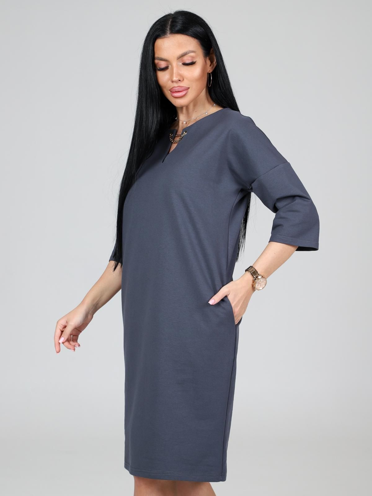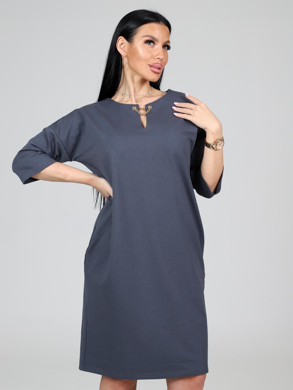 Платье подойдет для торжественного случая, а так же для повседневной носки. Модель прямого силуэта, длиной до колен, с карманами в боковых швах, рукав ¾. Модная, универсальная модель походит всем - стройным женщинам и дамам с формами.