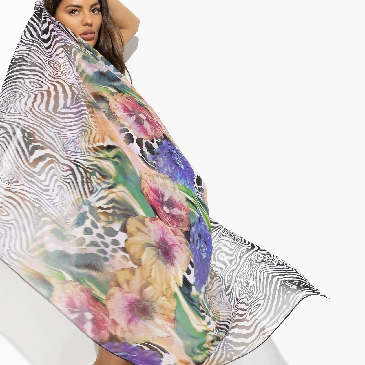 Сочетание анималистичного, цветочного и абстрактного принтов на одном отрезке ткани говорит о том, что от вашей фантазии зависит ваш образ. Летний, озорной и немного дерзкий. А как иначе?! Нужно попробовать все, лето не вечное. Парэо из легкого материала в сочетании контрастных принтов. Край обработан.