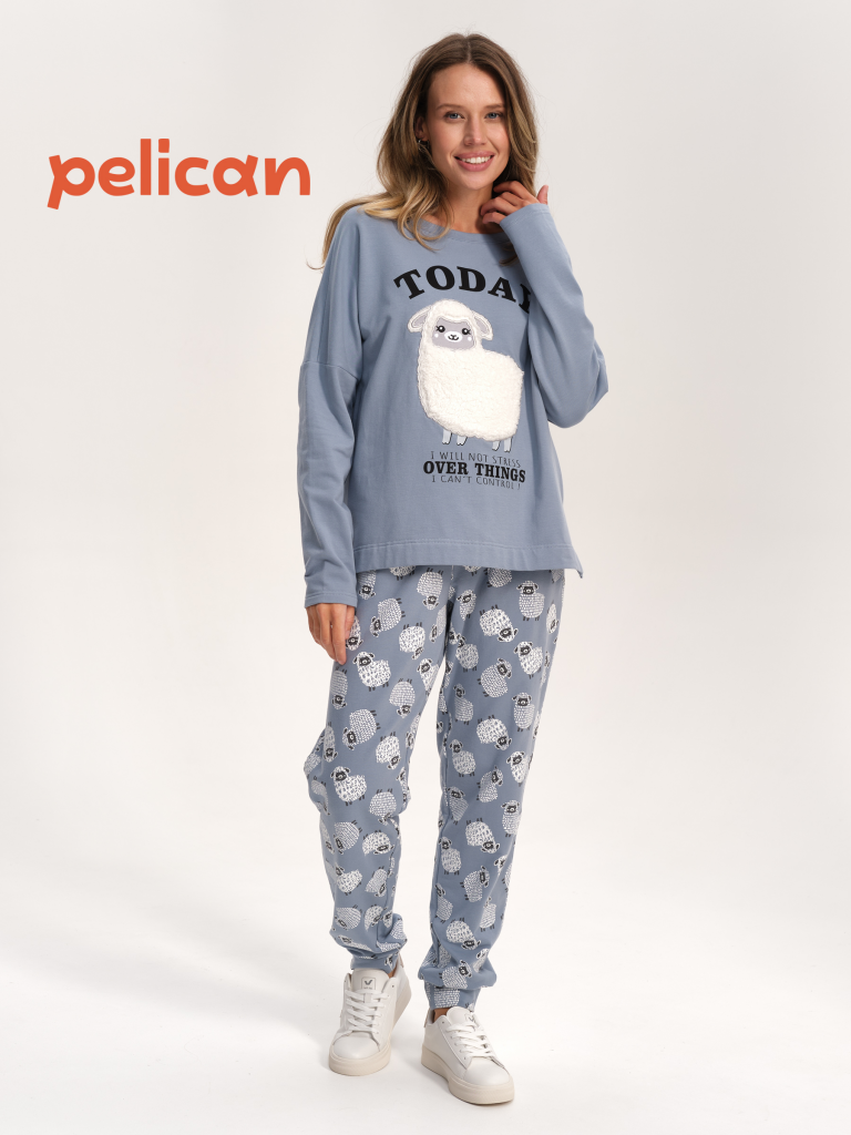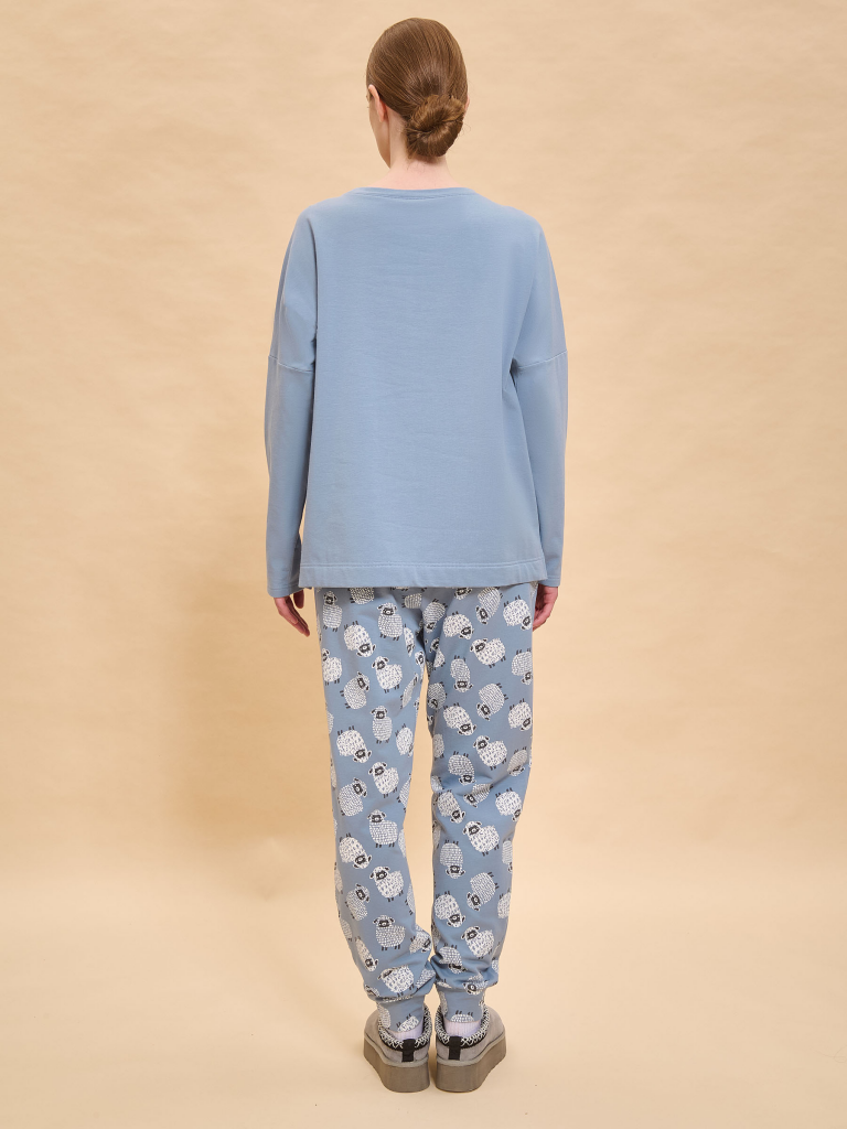 Костюм женский их футера с начесом: толстовка и брюки. Теплая, мягкая, приятная на ощупь ткань с 95% хлопка в составе – почти не мнется, сохраняет форму даже после частых стирок. Свободный крой толстовки и спущенное плечо – комфортный и модный оверсайз. Оригинальное решение - объемная нашивка из любимого тедди-флиса в виде милейшей овечки, которая перекликается с принтом на штанах. Большой объем брюк в области бедер и сужение книзу за счет манжетов из основной ткани делают брюки удобными в носке. Домашний утепленный комплект отлично подходит на осенне-зимний сезон, а также согреет на природе прохладными летними вечерами. Состав: верх: 95%хлопок 5%эластан, низ: 95%хлопок 5%эластан Возрастная группа: Standard Сезон: Осень Год: 2022 Пол: Женщины