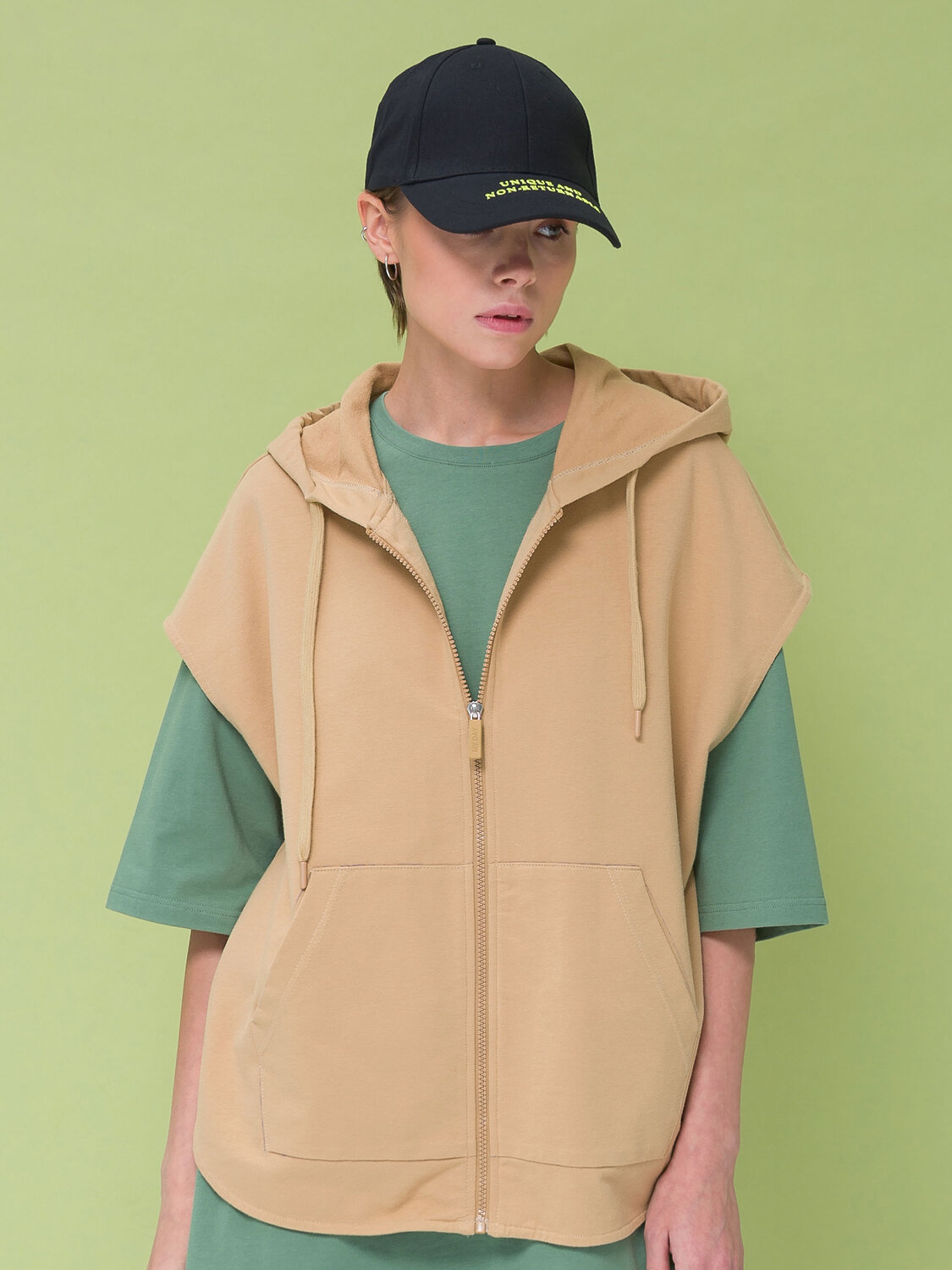 Однотонный женский жилет из футера. Теплая, мягкая, приятная на ощупь ткань с 96% хлопка в составе – почти не мнется, сохраняет форму даже после частых стирок. Капюшон регулируется, резиновые наконечники на шнуре – удобные и тактильно приятные фишки. Тракторная молния прочная, не заедает. Максимально широкая увеличенная пройма – для свободы движения и удобства комбинирования с другой одеждой. Объемные и функциональные карманы. Жилет великолепно сочетается с футболками оверсайз. Подходит на каждый день, незаменим для активного отдыха, спорта и путешествий.