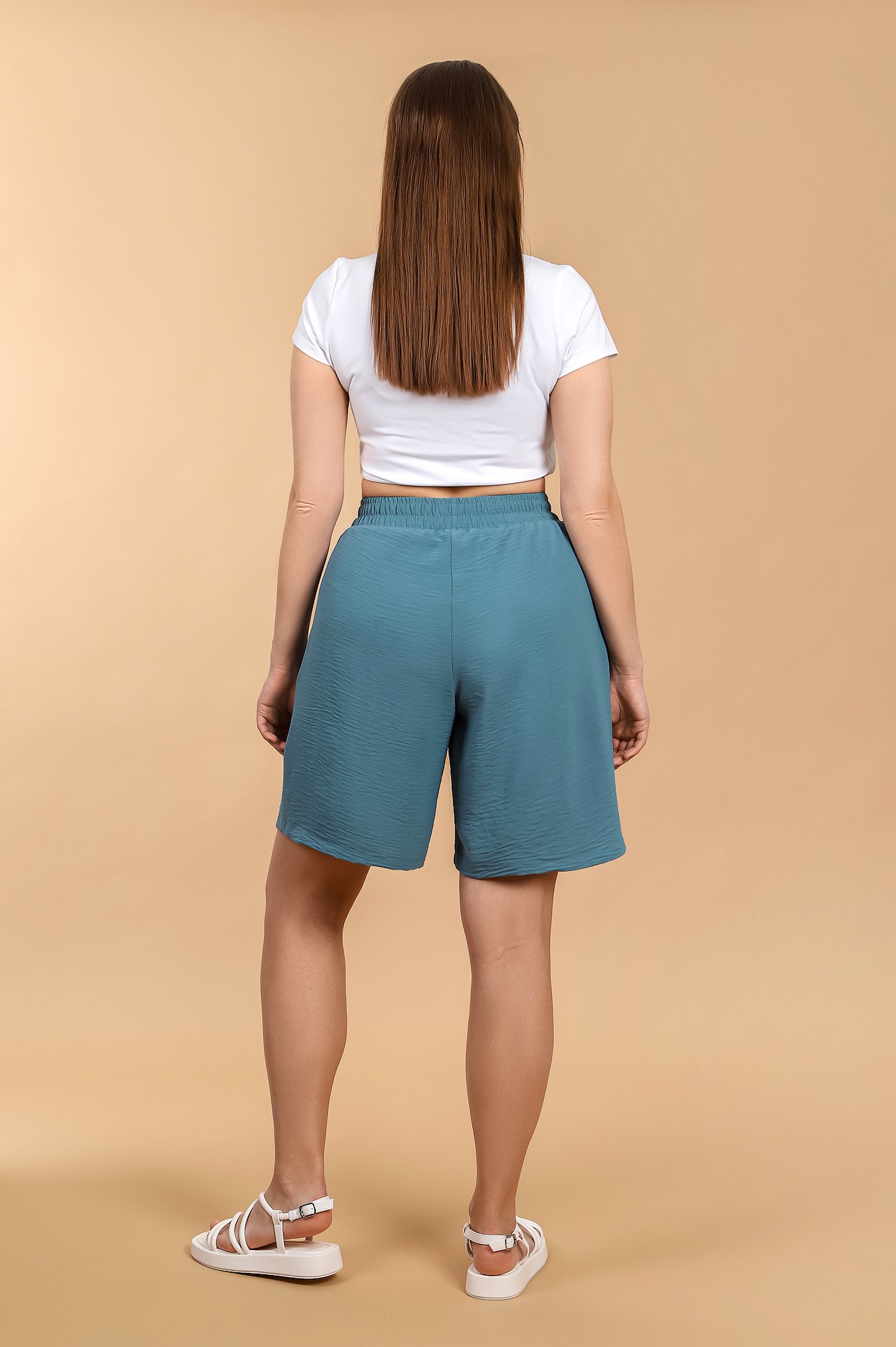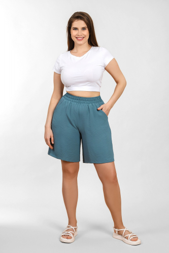 Шорты женские из тканого гладкокрашеного полотна «Лен Манго», свободного покроя средней длины, с карманами в боковых швах, на притачном поясе с эластичной тесьмой внутри.