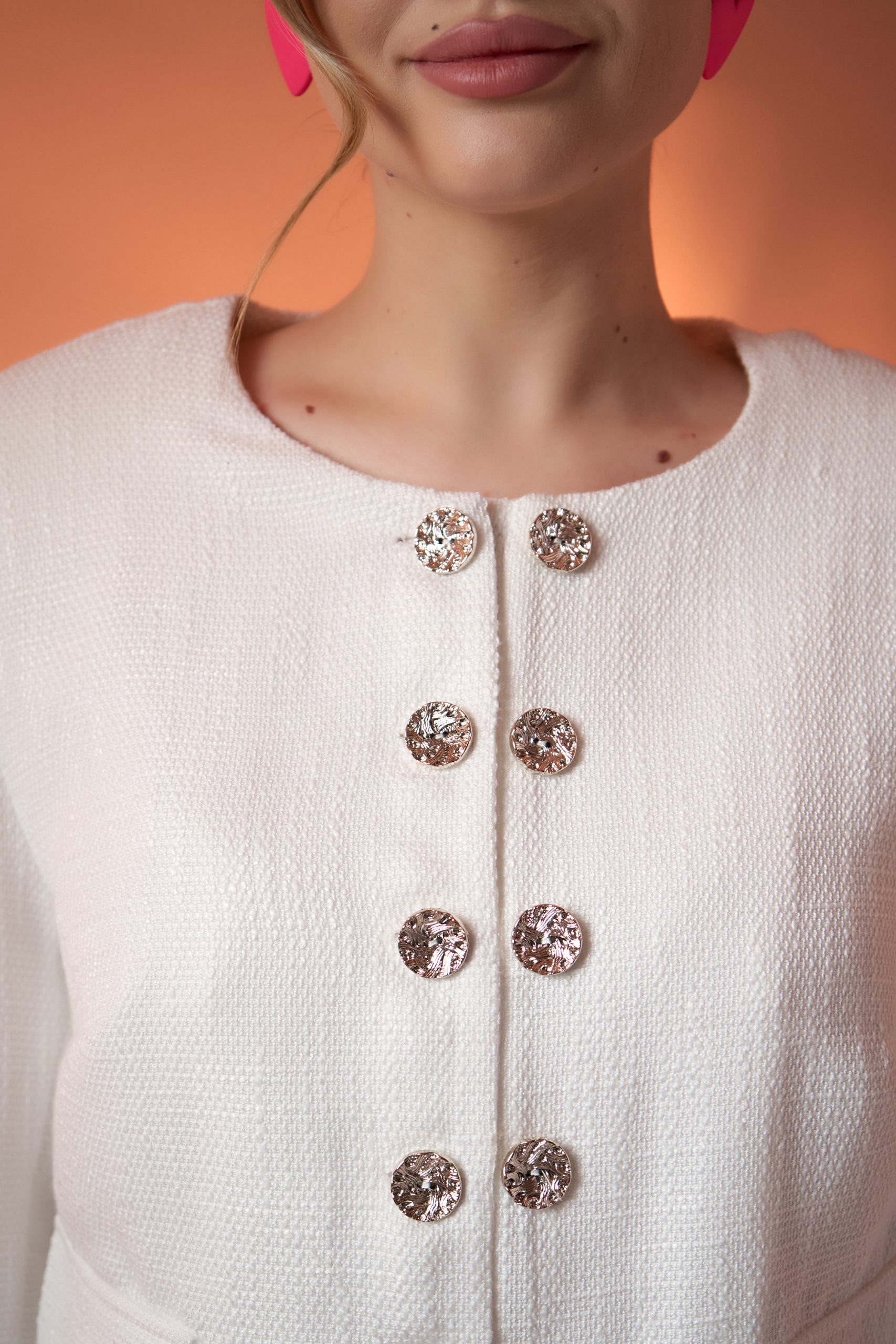 Центральная застёжка оформлена рядом декоративных металлических пуговиц с жемчужным эффектом, которые перекликаются с оформлением клапанов карманов и создают характерный ювелирный акцент. Накладные карманы с клапанами расположены симметрично по переду и добавляют жакету графичность и завершённость.