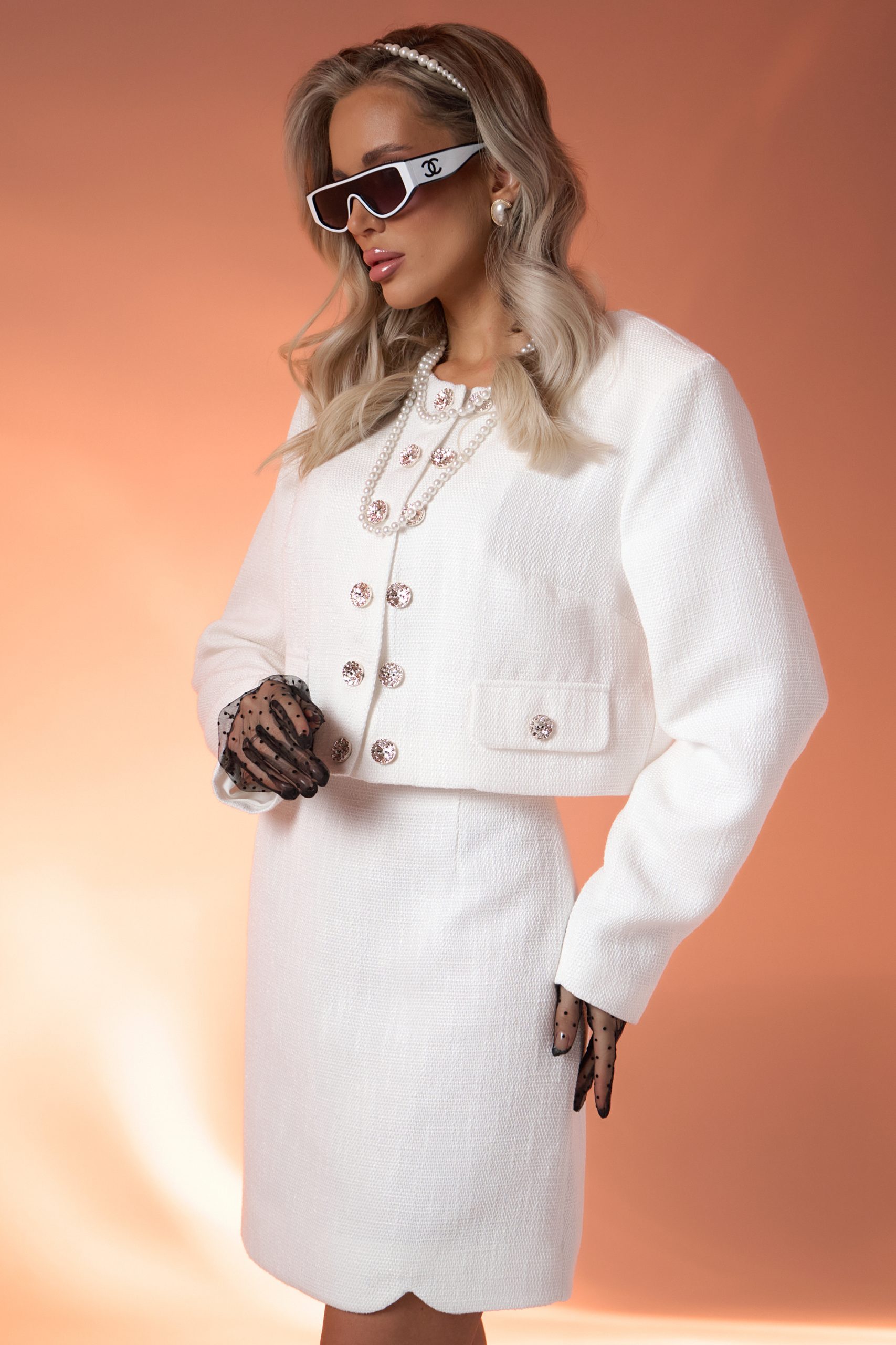Элегантный костюм из костюмного твида — воплощение современной классики с тонким французским настроением. Благородная фактура, мягкая структура и изысканные декоративные акценты формируют утончённый силуэт и делают образ собранным и женственным.