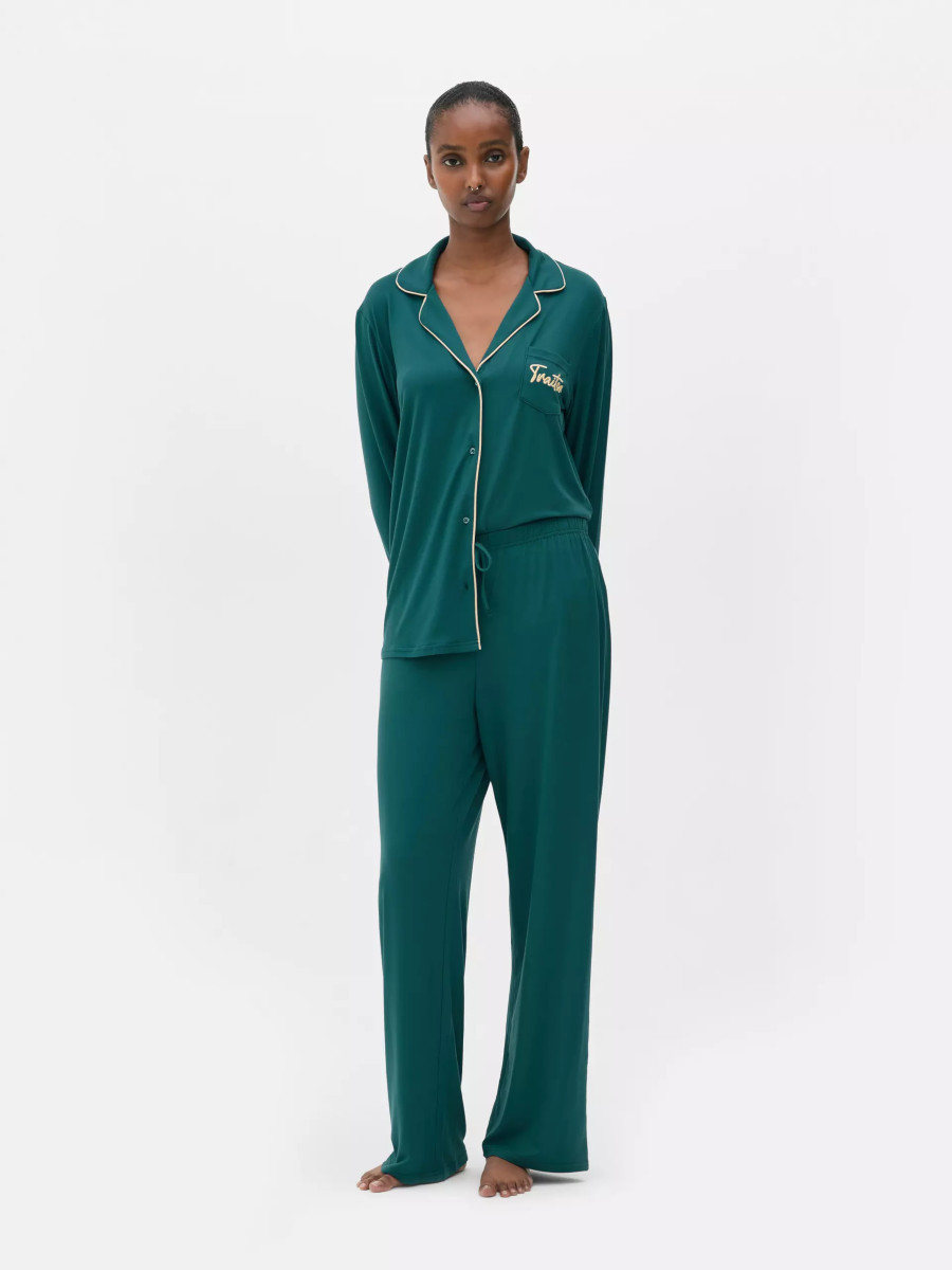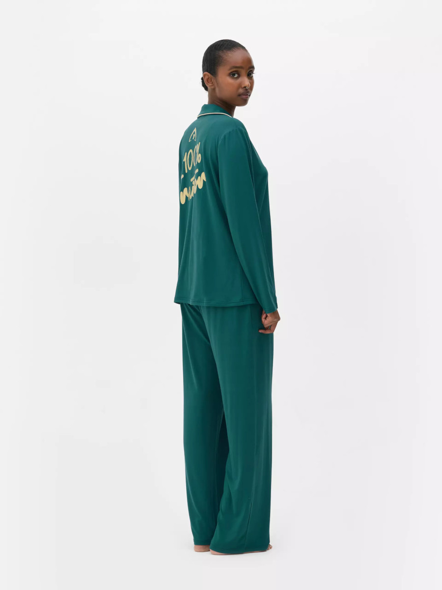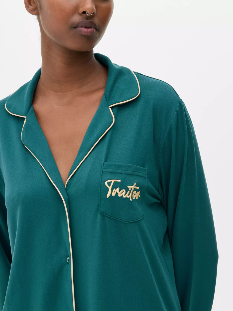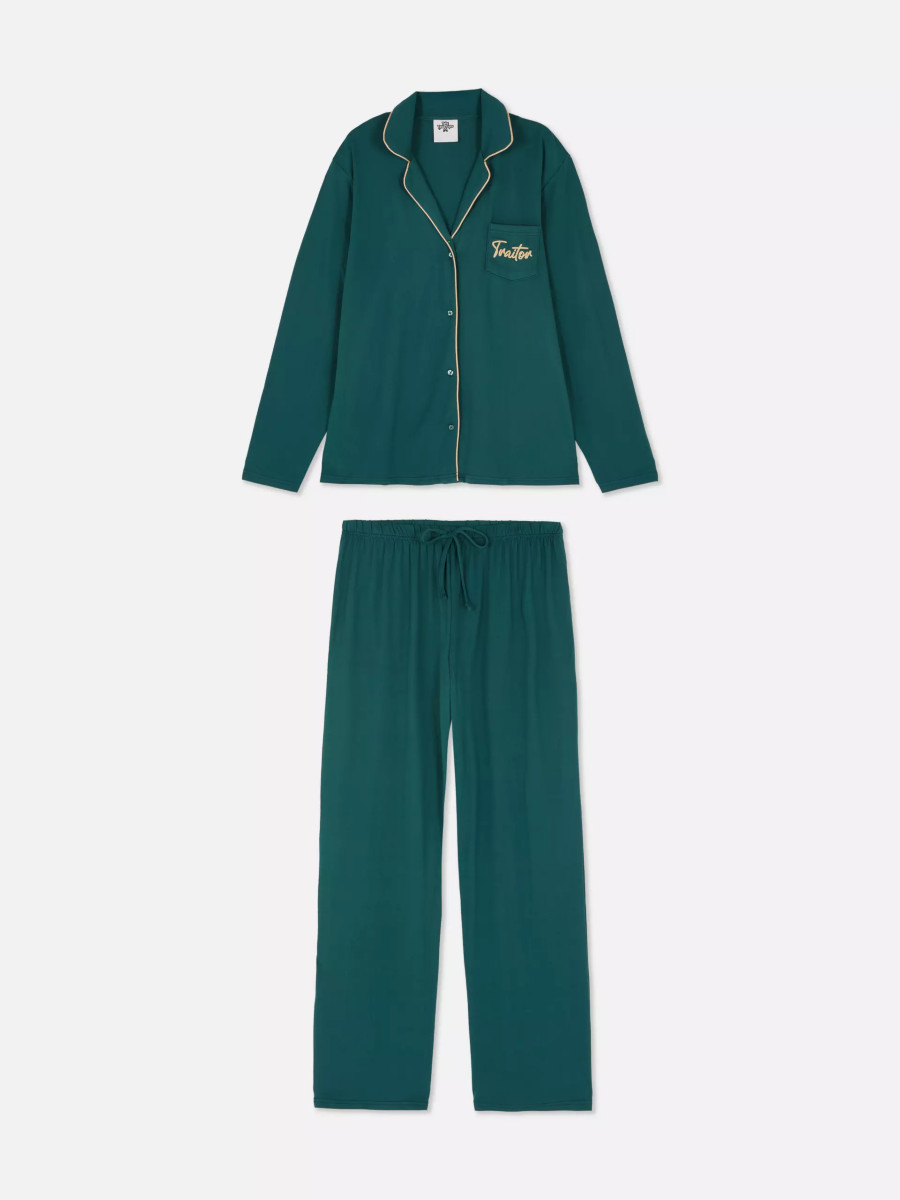 Создайте уютный стиль с этим сценарием Traitors, идеально подходит для ночей, наполненных бездельем. Разработанный d зеленом цвете с гладким золотистым рисунком, набор включает в себя рубашку с длинными рукавами на пуговицах с вырезом с воротником, длинными рукавами и нагрудным карманом, вышитым небольшим шрифтом «Traitors». Повернитесь, чтобы показать смелую графику «100% Traitors» с задней частью с культовой фигурой в капюшоне. Соответствующие брюки в полный рост поставляются с расслабленной посадкой и эластичным поясом для шнурков для удобства. Сделанные из мягкой, легкой ткани, эти пижамы привносят небольшую загадку в ваше время простоя.