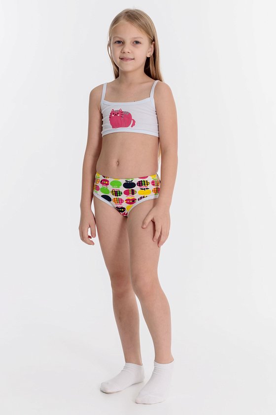 Комплект белья для девочки топ и трусы выполнен из хлопковой ткани с добавлением лайкры. Топ однотонный, на тонких бретелях, украшенных атласными бантиками. Спереди нанесён принт. Трусы из полотна с набивным рисунком, пояс на резинке.