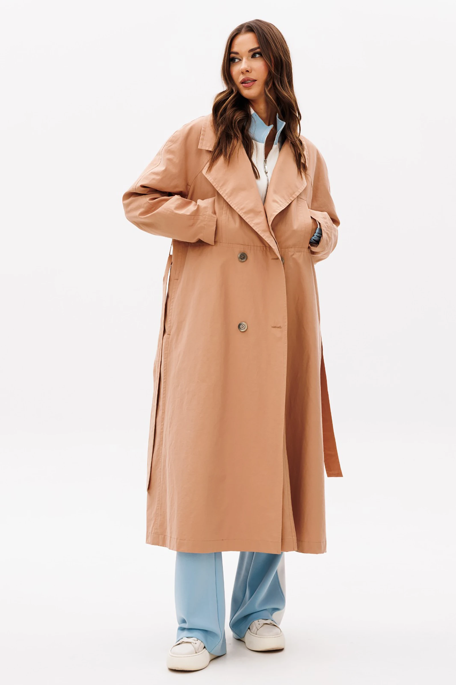 Тренчкот не выходит из моды с тех пор, как Коко Шанель представила этот вид одежды в женской, ведь до этого тренч являлся исключительно мужской одеждой. Сегодня этот вид плаща можно смело назвать базовым, его актуальность переходит из сезона в сезон.Классический вариант тренча покроя реглан в удлинённом варианте с поясом, отложным расширенным пиджачным воротником, встречной складкой по спинке, подрезом по переду и двубортной застёжкой.Полочки с боковыми карманами в рельефе и прорезными листочками в верхней части. Все фигурные линии отделочных деталей подчёркнуты широкими отделочными строчками.В качестве фурнитуры выбраны стильные пуговицы. Плащ на отлетной по линии низа подкладке.Длина изделия по спинке около 120 см. Длина рукава с плечом около 75 см. бежевый