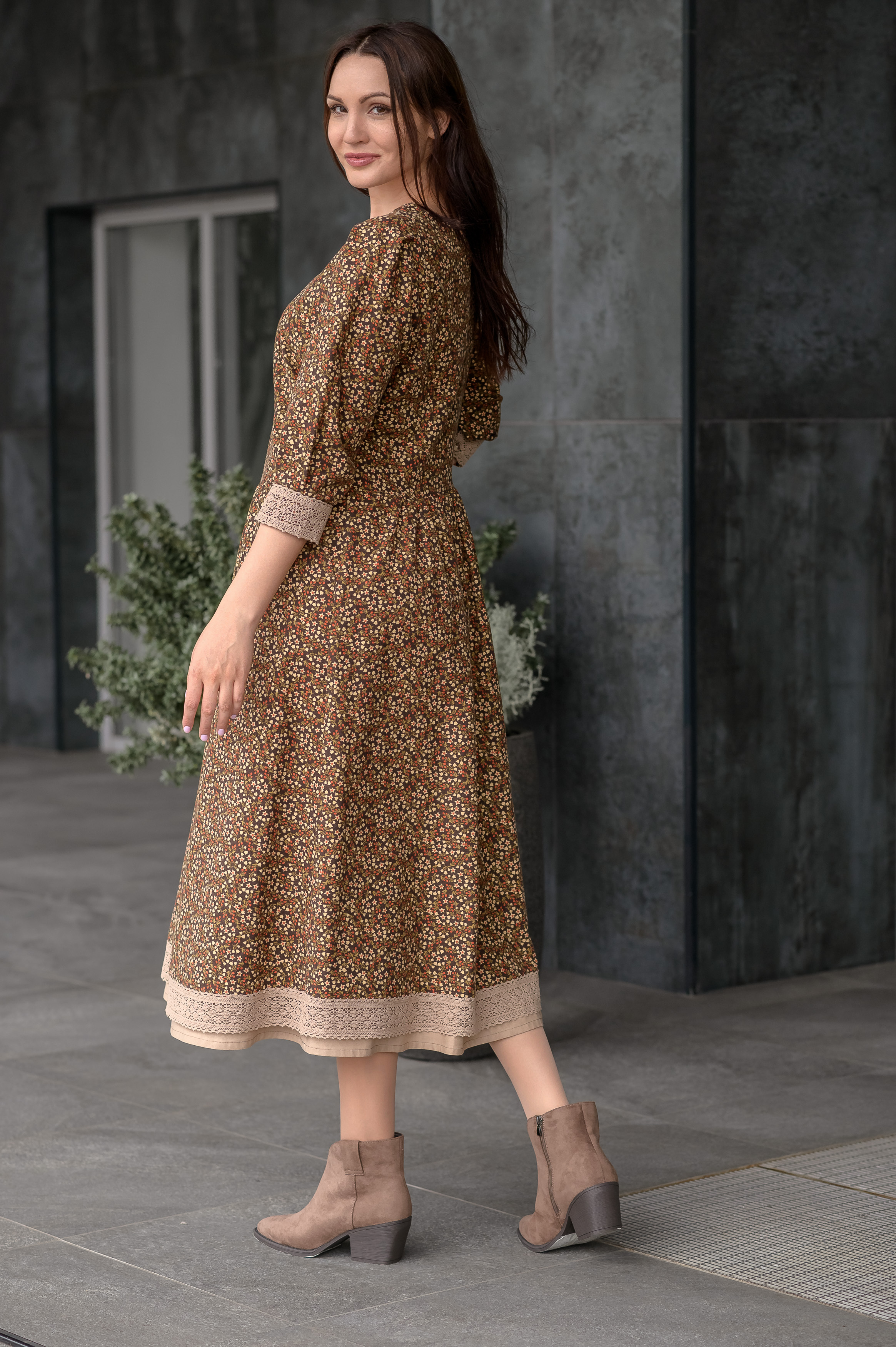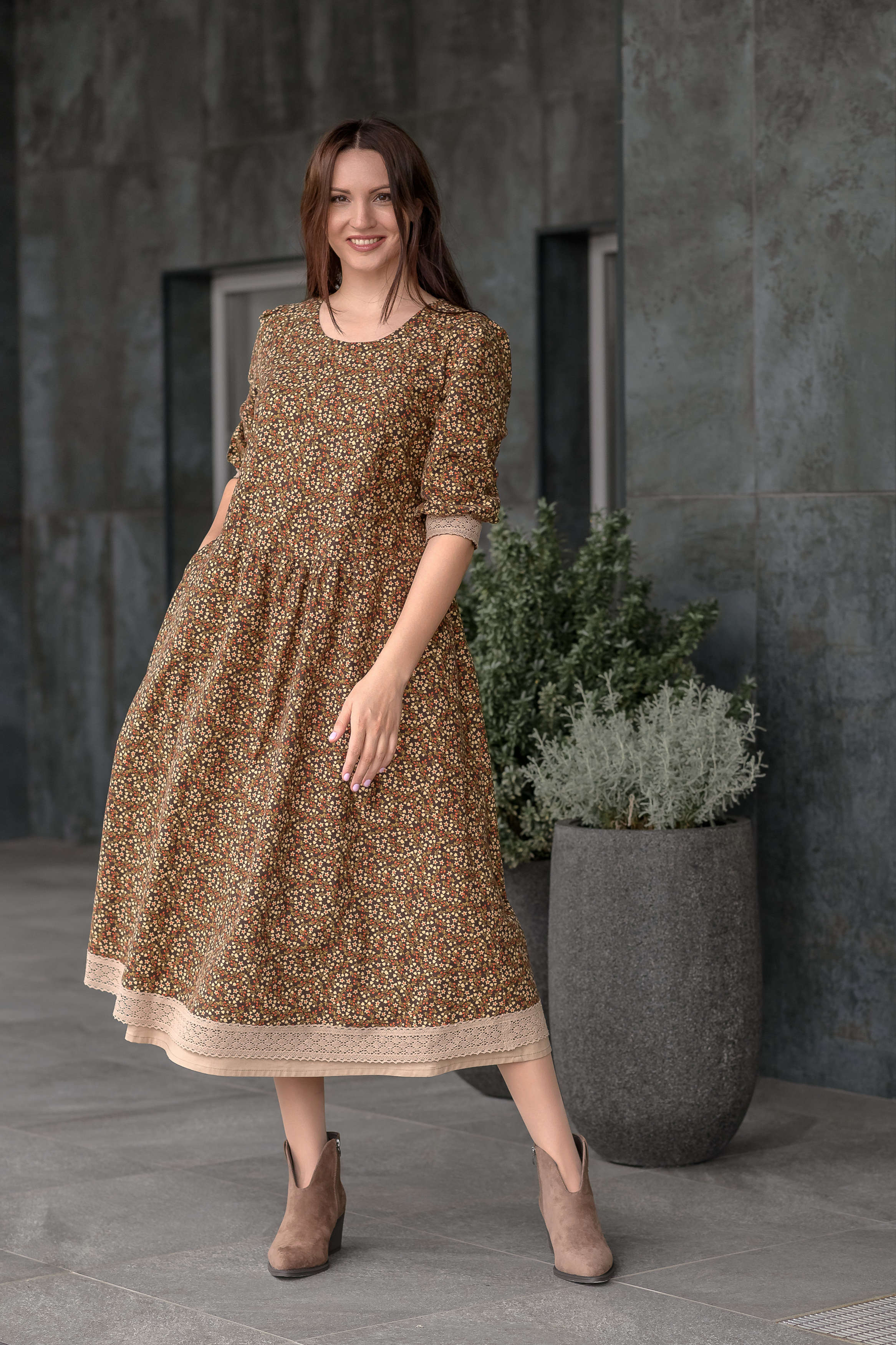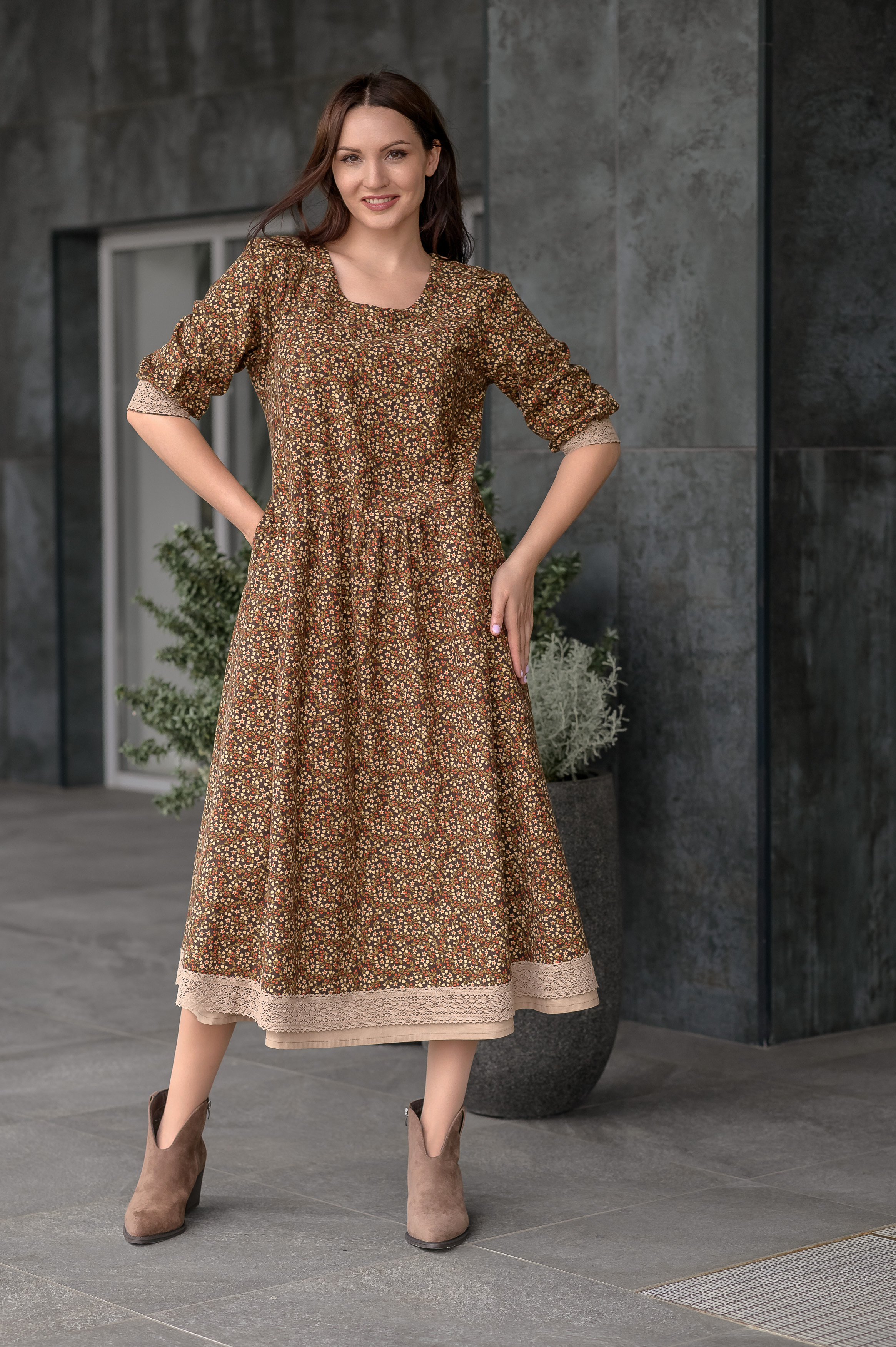 Мягкое и свободное платье из фланели. Втачной рукав с расширением к низу, визуально сужает ширину плеч и придает модели воздушность. Изделие декорировано по низу платья и низу рукава х/б кружевом. Имеются 2 боковых кармана.
