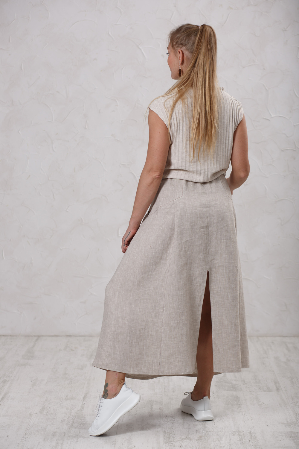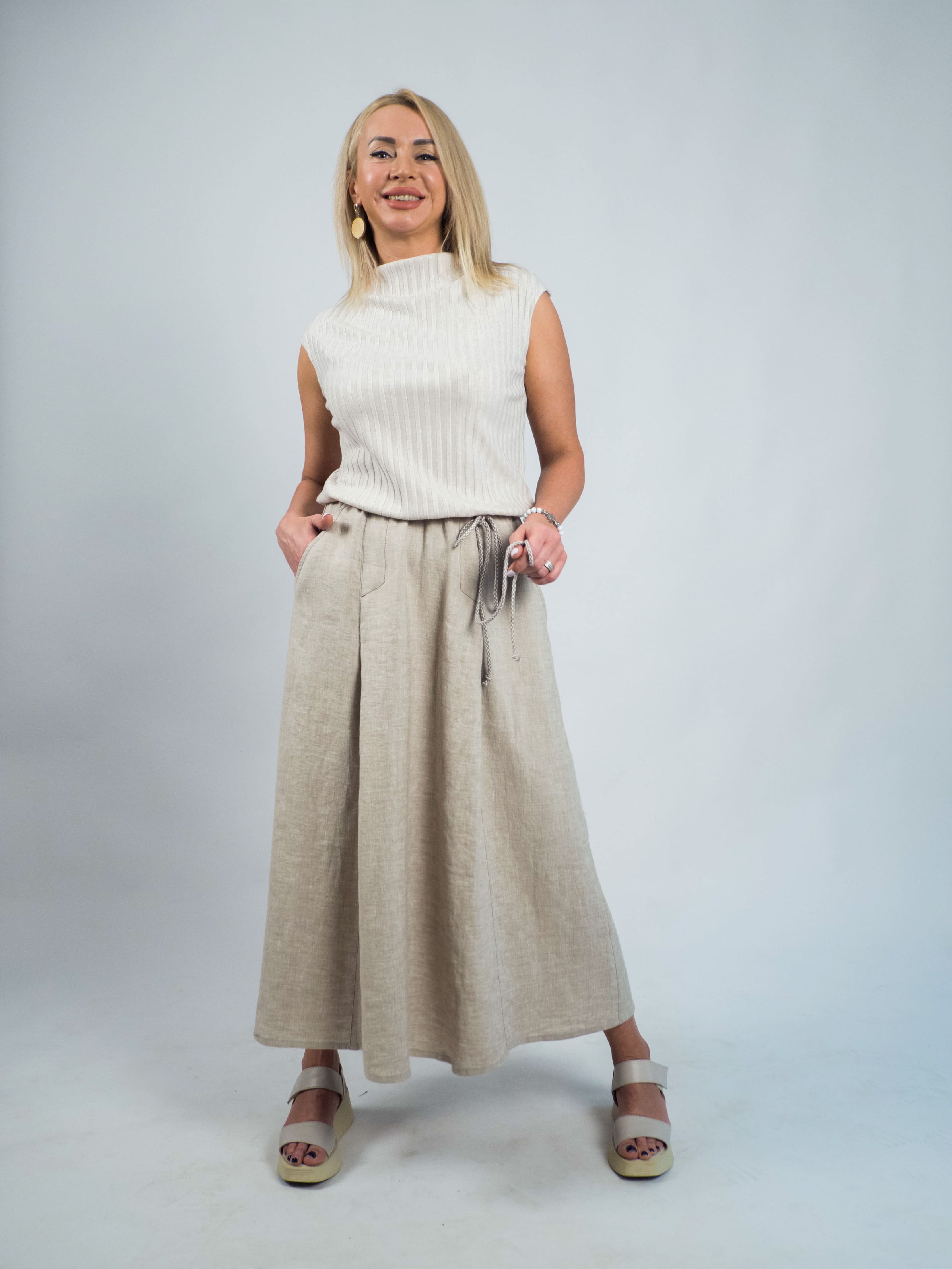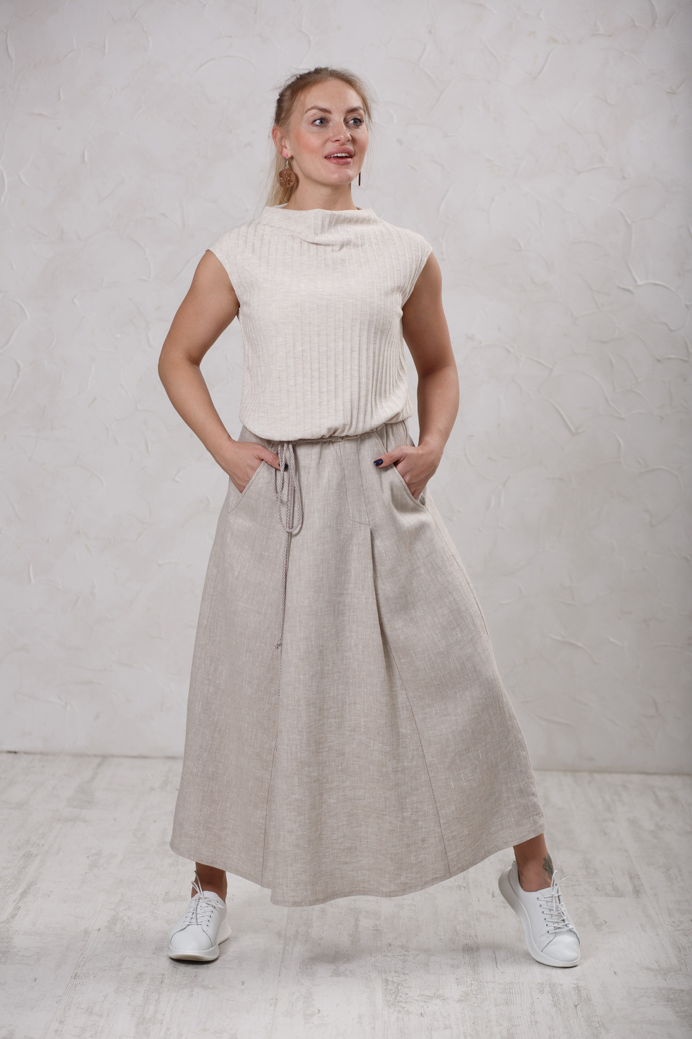 Оригинальное льняное платье, выполнено в сочетании разных материалов и фактур. Верх изделия трикотаж 100% хлопок, низ лен 100% с «эффектом мятости». По линии  соединения верха и низа платья с изнаночной стороны притачена тонкая резинка. Это позволяет фиксировать изделие на талии (либо чуть ниже) и при этом трикотажный верх образует в области живота небольшой «напуск», что делает вещь универсальной на любую полноту. Благодаря этому платье, которое не имеет застежки, можно легко одевать и снимать. В качестве отделочного элемента используется витой х\б шнур, который вставляется в тонкие шлевки по бокам.
