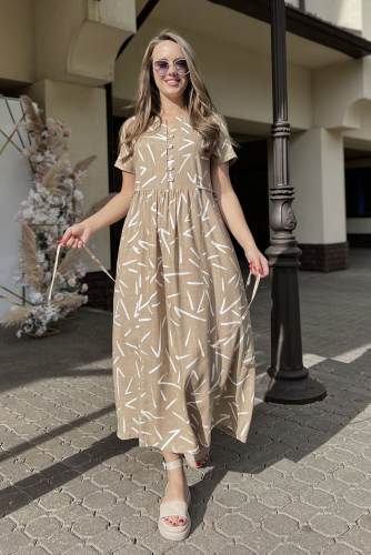 Летнее льняное платье прямого силуэта. Изделие, благодаря вертикальной полоске, визуально сократит «пышную» фигуру как минимум на размер. В конструкции платья нет четко обозначенных линии груди и линии талии, именно это позволяет использовать платье в любой ростовой категории. Освежающее и деликатно смотрятся детали белого цвета. Спущенный рукав закрывает предплечье.