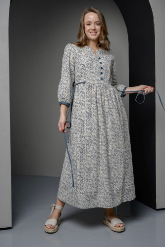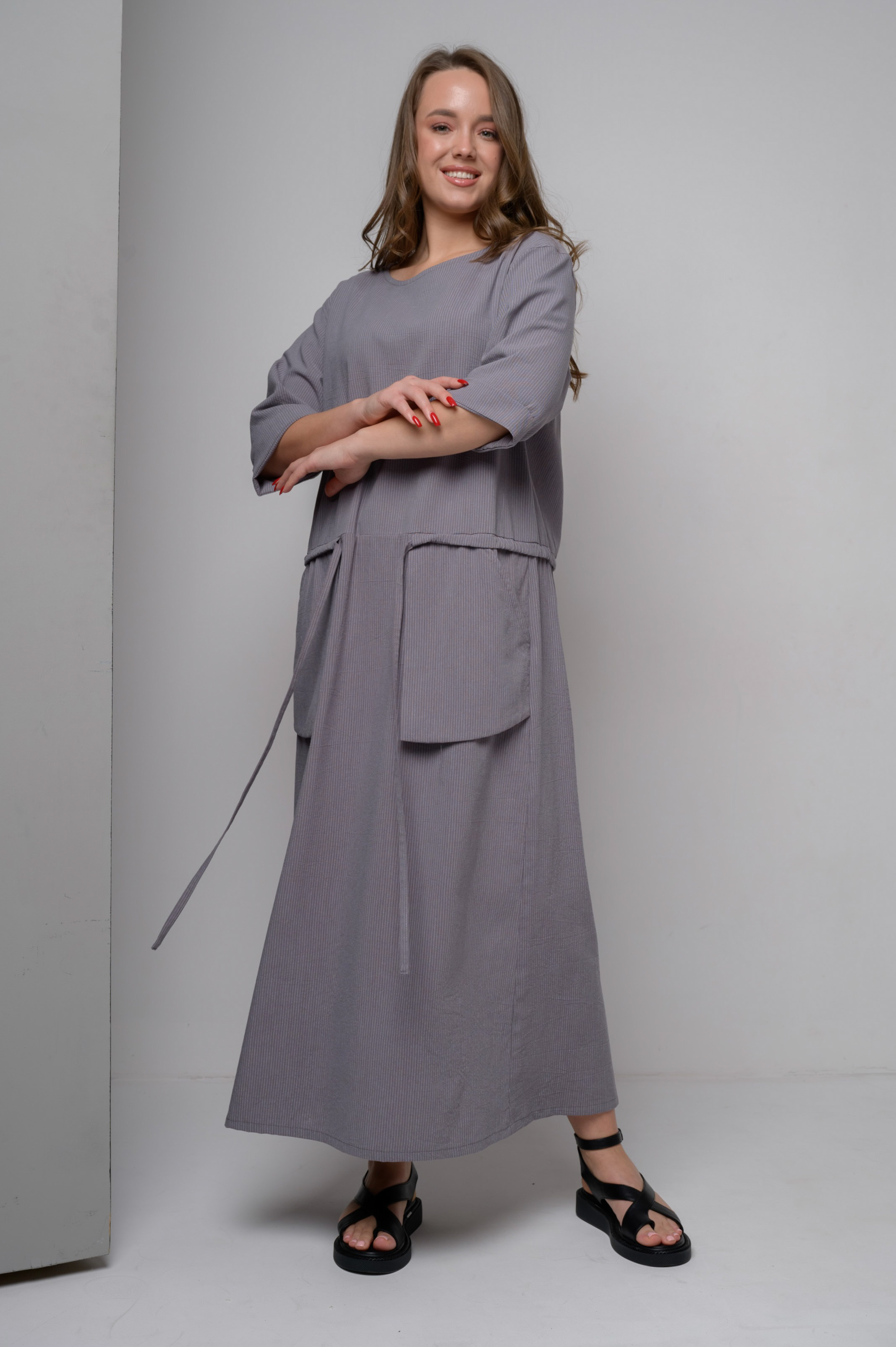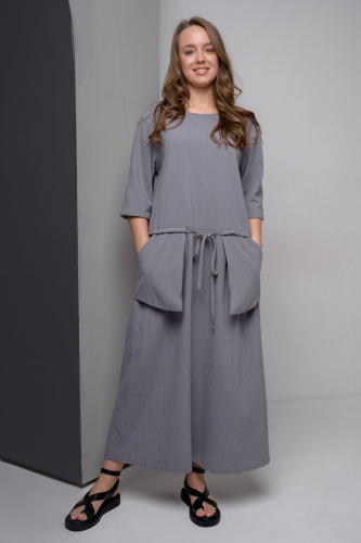 Длинное свободное платье в стиле Oversize из полосатой ткани  с эффектом крэш сядет на любую фигуру.  Прекрасно подходит для каждодневного ношения. Рукав 3/4. Кулиска чуть ниже линии талии  дает возможность экспериментировать с объемом. Акцентом в платье являются большие отлетные карманы. На спинке разрез