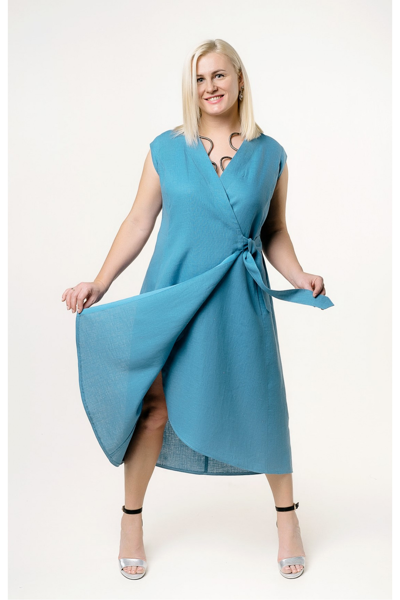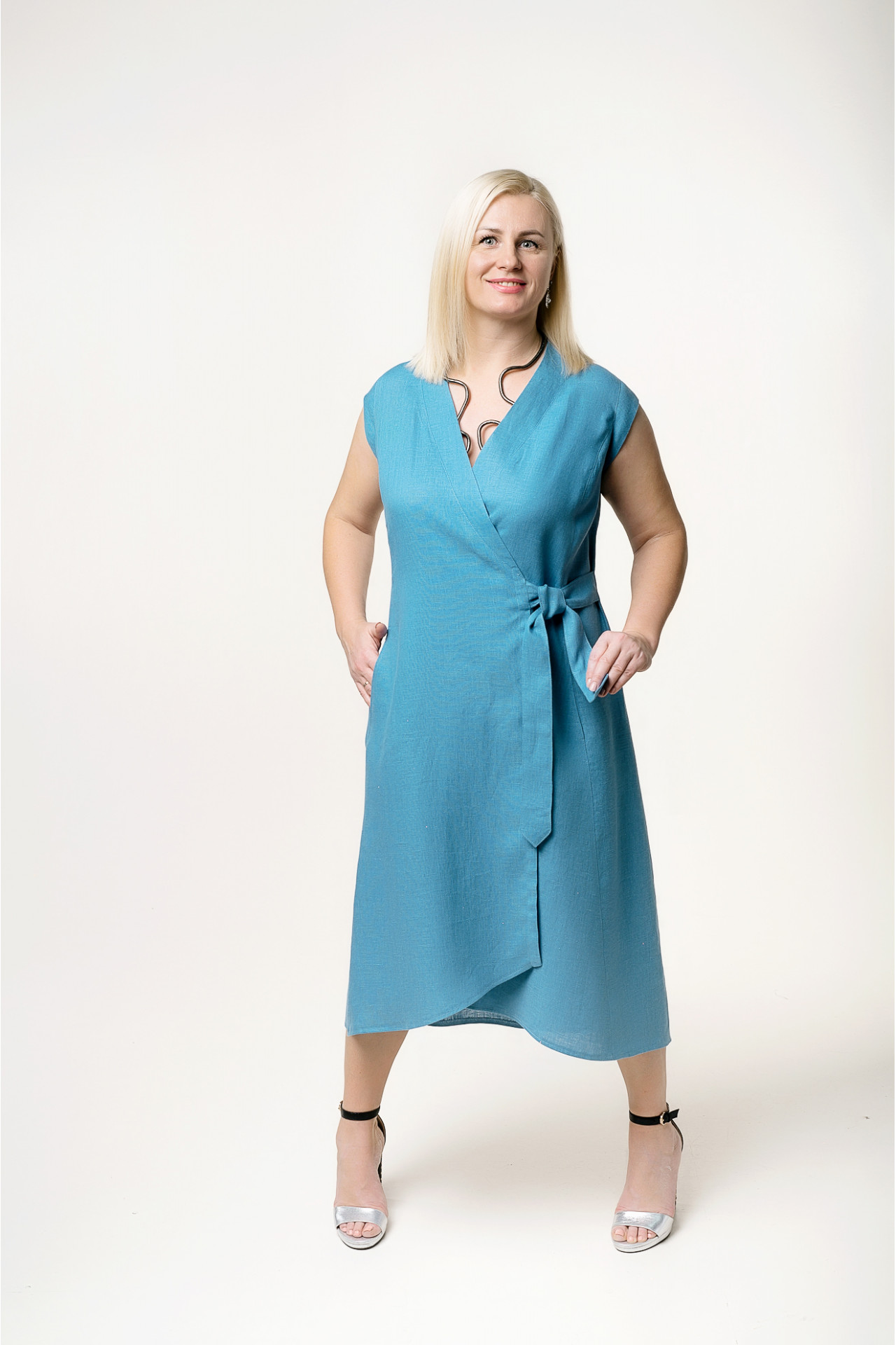 Летнее льняное платье «на запах». Очень эффектно изделие смотрится на фигурах любой полноты за счет приталивания. Внутренняя пола крепиться справа на тонкие заявки и исключает видимость белья при любом распахивании низа (ходьбе, ветре и т.д.)