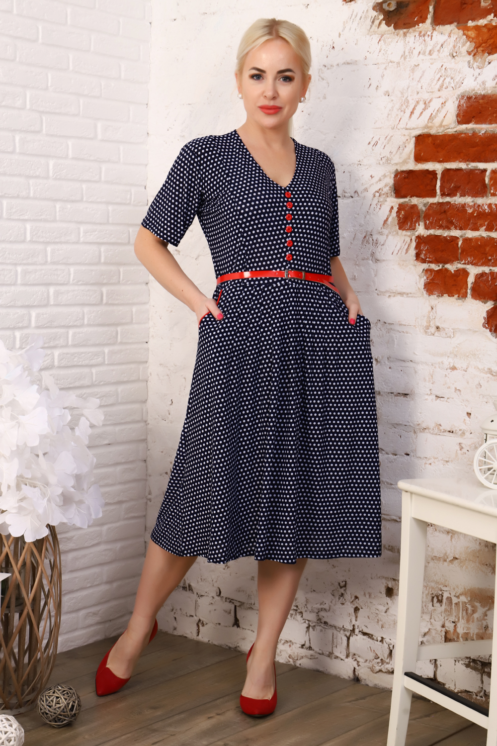 Платье с отрезной юбкой на складках с карманами, на карманах красная отделка, V-образный вырез, короткие рукава, на полочке передней декоративные красные пуговицы. Летнее, удобное и приятное к телу платье. Пояс в комплекте