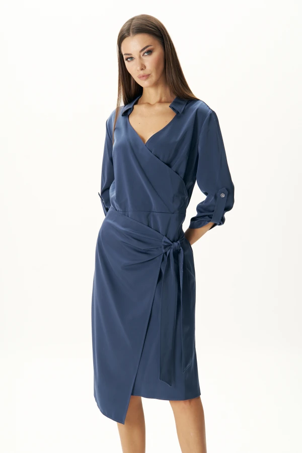 Модель – идеальная для торжественного выхода, да и в принципе для повседневного лука. Конечно же это платье – рубашка с запахом! Оно подходит всем типам фигуры. Лаконичное, но с изюминкой в крое, матовый плотный сатин придает модели пластичность и изысканность. Свободный упрямленный покрой, рубашечный рукав, воротник на -образном вырезе.Полочка отрезная по линии талии, лиф с нагрудной вытачкой и запахом, в боковой шов вставлена отделочная отлетная деталь со складками и поясом. Спина с отрезной кокеткой и мягкой бантовой складкой. Рукав с отделочной патой.Длина платья около 102 см. Длина рукава около 48 см.