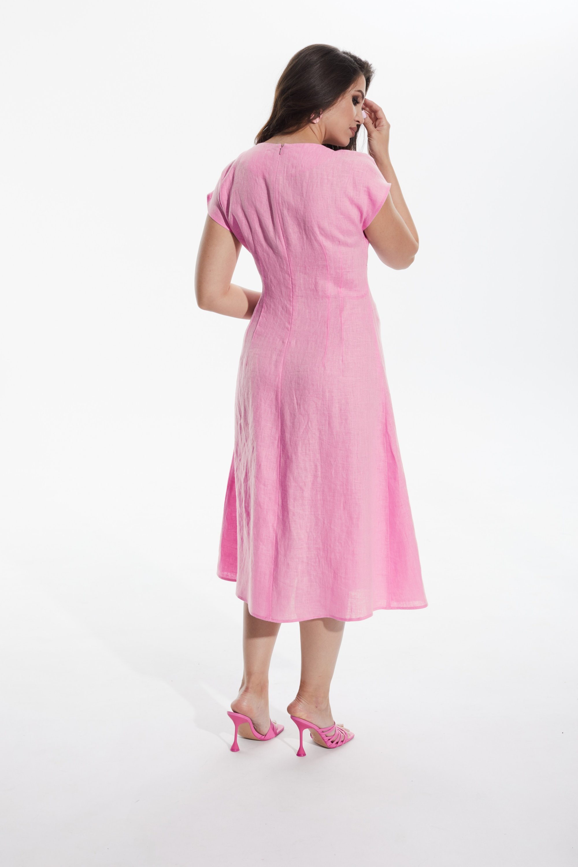 Платье женское полуприлегающего силуэта с расклешением книзу. Перед со средним швом, расстроченный с двух сторон отделочной строчкой, и горизонтальной вставкой в области талии, имитирующей корсетный пояс с рельефами, отстроченными отделочными строчками. Спинка с четырьмя талиевыми вытачками и средним швом, вверху которого выполнена потайная молния до талии. Горловина углублена, округлой формы, на планке. Платье без рукавов, со спущенной линией плеча.
