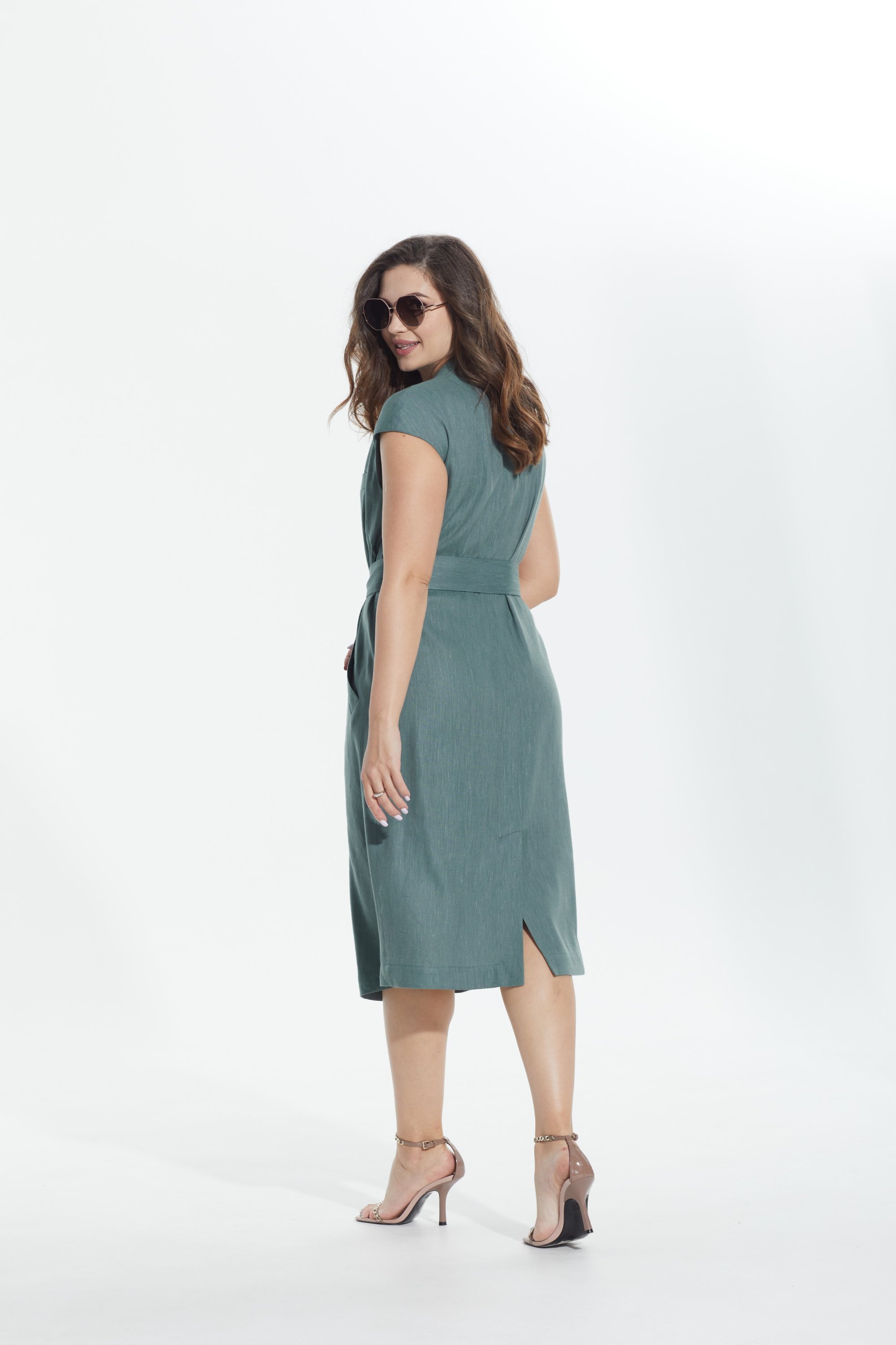 Платье женское прямого силуэта на центральной двубортной застёжке на декоративные петли и пуговицы. Перед с нагрудными вытачками из боковых швов, наклонными карманами с листочкой в области бёдер и имитацией нагрудного косого кармана с листочкой. Линия плеча спущена. Спинка со средним швом, внизу которого выполнена шлица. Горловина V–образной формы с цельнокроенной стойкой по спинке. Платье без рукавов со съёмным поясом и декоративной пряжкой.