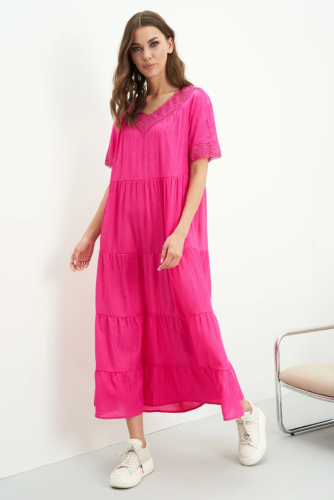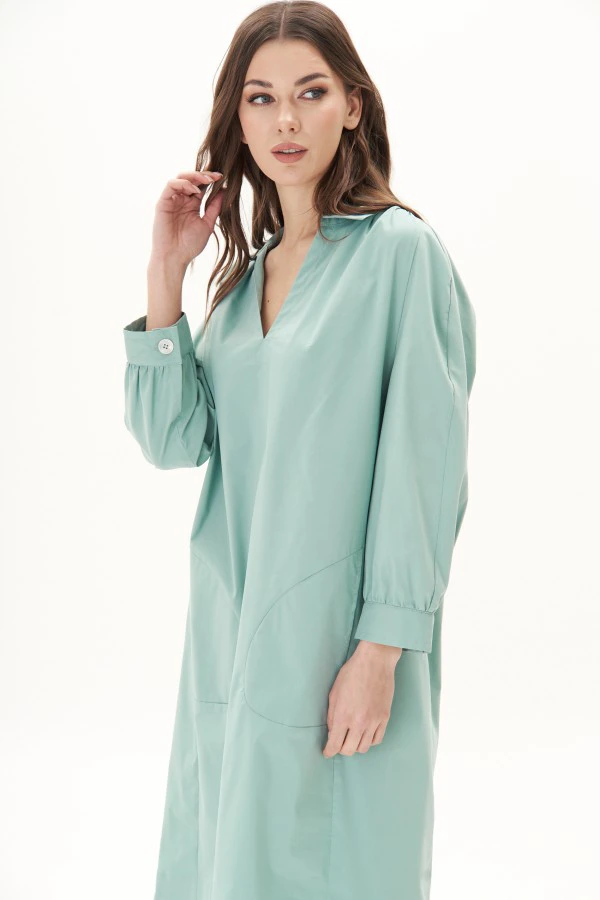 На ряду с брючными комплектами, платья в минималистично-сдержанной стилистике уверенно занимают свою нишу в модном весеннем гардеробе. Ведь это универсальное решение на все случаи жизни: куда бы вы не отправились, в таком платье вы всегда на высоте.Простой лаконичный силуэт, сложный комбинированный покрой, стояче отложной воротник. Полочка с отрезными бочками, карманами в рельефе, сборкой по плечевому шву.Спинка с отрезной кокеткой, сборкой по линии притачивания воротника и отрезным наклонным бочком.Рукав-полуреглан спереди и цельнокроенный на спинке. Рукав 34 на отрезной манжете. Линия низа - ассиметричная.Длина платья около 102 см, длина рукава с плечом около 61 см.