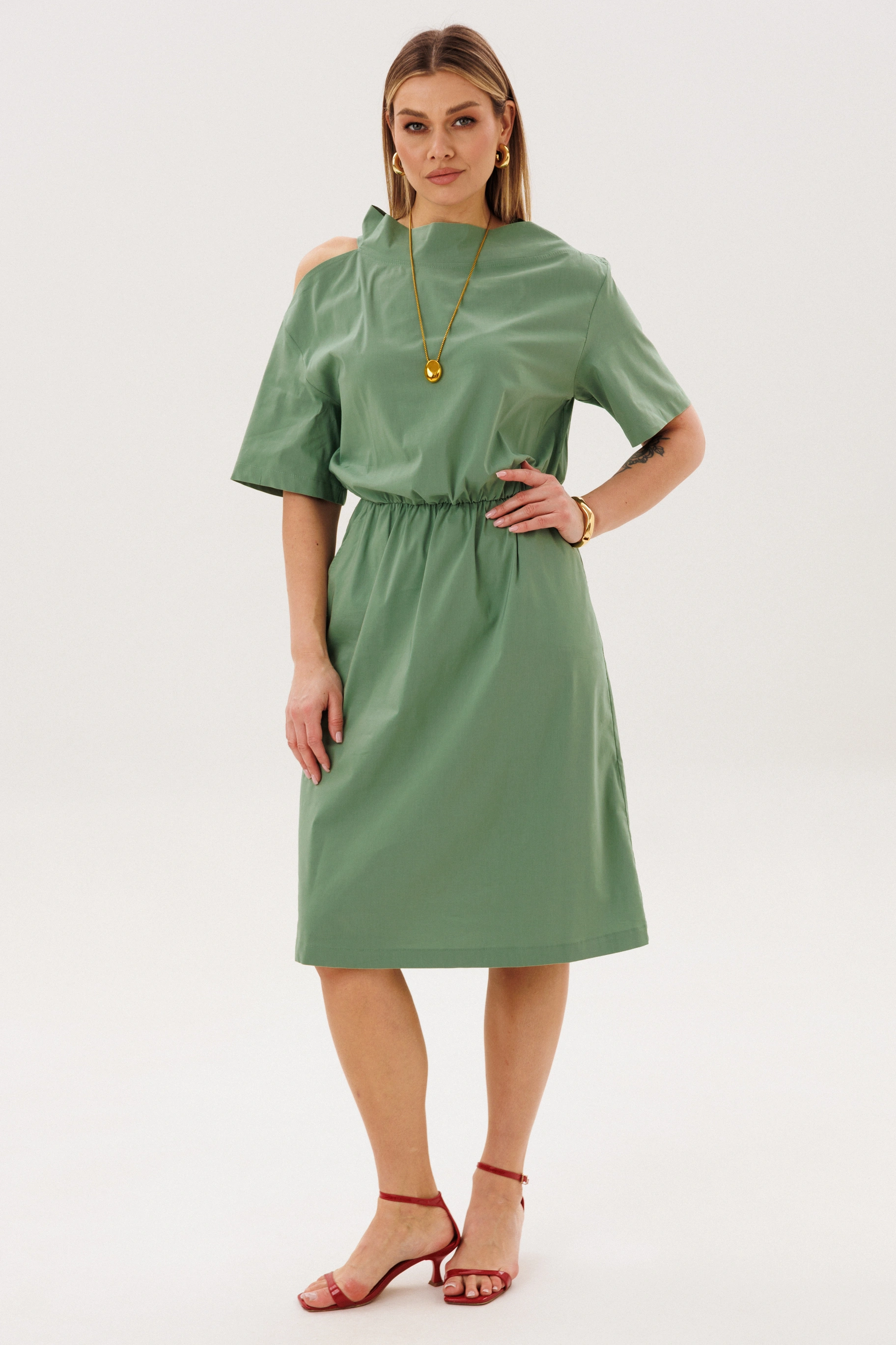 Весенний сезон всегда знаменуется обновлением гардероба, обязательным наличием в котором будут, конечно же, платья! Стильное и лаконичное миди! Эта универсальная модель станет отличным базовым предметом вашего гардероба.Свободный А-образный силуэт, рубашечный покрой, ассиметричная горловина, изысканный открытый участок плеча, эластичная тесьма по линии талии, съёмный пояс на полукольцах.Длина платья около 107 см, длина рукава около 30 см.