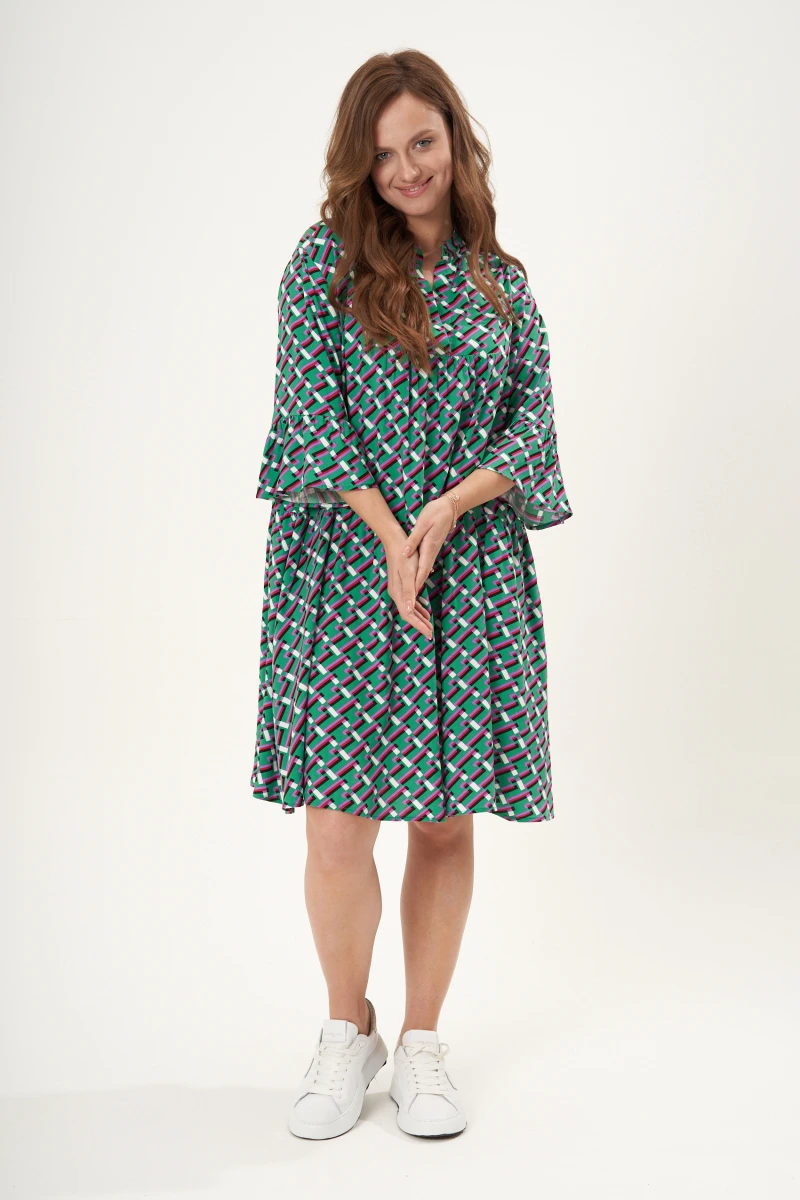 Летние платья в стиле бохо очень популярны этим летом, ведь они помогают любой женщине чувствовать себя свободно, женственно, красиво и при этом быть стильной.Для такого платья нет никаких ограничений: ни в возрасте его хозяйки, ни в её фигуре, а значит, такое платье Вам однозначно стоит добавить в свой гардероб.При выборе платья предлагаем остановить свой выбор на модели из лёгкой дышащей ткани, воздухопроницаемой, струящейся.Платье свободной конической формы, рубашечного силуэта в актуальной миди-длине. Рукава длиной 34 на спущенной линии проймы с воланом по низу.По переду - втачная кокетка без застёжки. Воротник - стойка. Спинка с горизонтальной кокеткой. От кокеток по центрам переда и спинки - лёгкая сборка.Нижняя часть платья оформлена в виде широкого волана со сборкой по линии притачивания.Длина платья по центру спинки около 96 см. Длина рукава с плечом от линии горловины до низа 56 см.