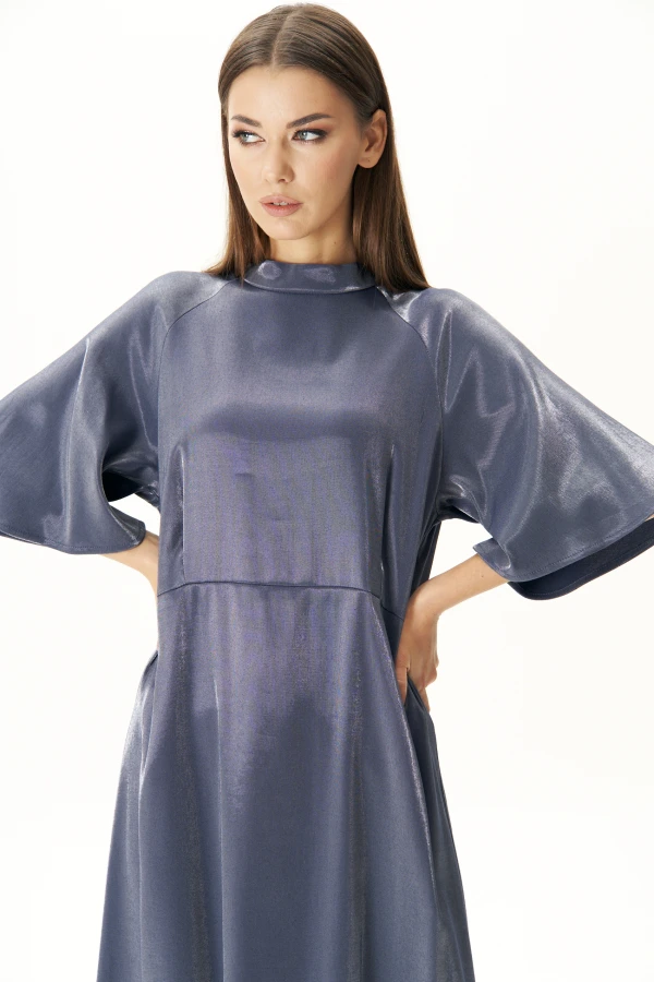Чаще всего нарядные платья ассоциируются с платьем в пол. Длинное платье не очень практично в обычной жизни, но оно, бесспорно, красиво, женственно и идеально для торжества и особого случая. Не упустите свой шанс надеть длинное платье и почувствовать себя настоящей королевой.Платье из лёгкой формоустойчивой ткани с эффектом серебристого напыления А-образной формы имеет членение фигурной формы чуть выше линии талии, подходящее абсолютно для всех типов фигур.В верхней части переда - фигурные складки, по спинке - эластичная тесьма, которая мягко фиксирует лёгкую сборку.Платье покроя реглан с широкими акцентными рукавами длиной ниже линии локтя.Воротник - стойка на расширенной линии горловины, застёгивается сзади на пуговку-страз, образуя по центру спинки небольшой вырез треугольной формы.Длина платья по спинке около 128 см, длина рукава от воротника около 43 см.