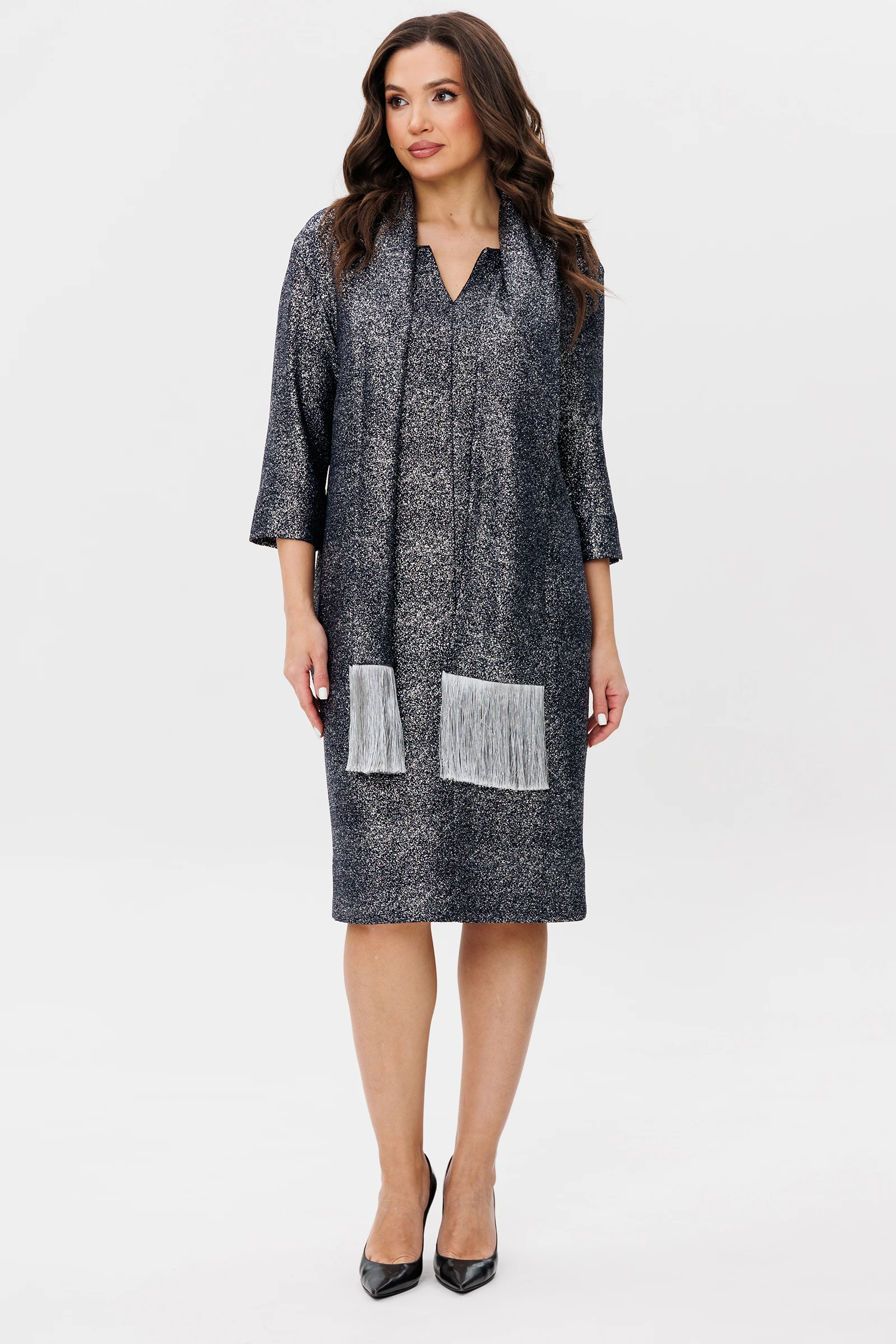 Сверкающие металлизированные поверхности-проверенный способ не остаться незамеченной.Серебренное напыление поддержанное эффектной бахромой, в лаконичном платье шифт длины миди, отличный выбор для праздничного настроения.Свободный упрямлённый силуэт со слегка заниженной линией плеча. Полочка с центральным швом и декоративным разрезом горловины. Спинка с центральным швом. Рукав двухшовный с разрезом в переднем шве.Воротник-шарф, косого кроя с отделочной бахромой. По боковым швам-небольшие разрезы.Длина платья около 107 см.Длина рукава с плечом около 62 см.