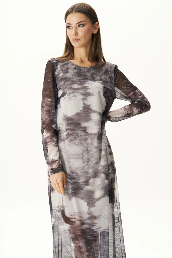 Платье из сетки сегодня стало одним из самых популярных в мире моды.Выполнено из мелкой матовой сетки с оригинальным дизайнерским принтом-такое платье станет отличной альтернативой вязанным и кружевным нарядам - лёгкое, струящееся, соблазнительное.Наше платье простое по покрою-может быть вполне праздничным, если подобрать к нему аксессуары и обувь.Отлично вписывается оно и в ежедневный гардероб, позволяя собирать новые интересные и стильные образы.Платье прямого силуэта с втачными длинными узкими рукавами.Вырез горловины красивой овальной форм.Перед и спинка платья-на мягкой трикотажной подкладке телесного тона.Длина изделия около -128 см.Длина рукава около- 63 см.